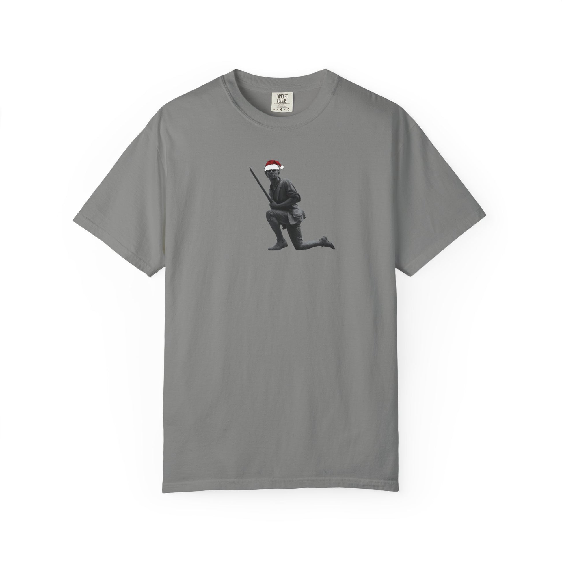 For any town and any Minuteman enthusiast, this option has no text with small front chest pocket and rear large Minuteman original art. The Holiday Minuteman Series tee takes our Original Art Series cut and gives it a Revolutionary twist. Crafted from soft, heavyweight 6.1 oz garment-dyed ring-spun U.S. cotton, it has that lived-in feel with the sturdy structure you want for years of wear. The relaxed, straight silhouette and tubular knit body keep the lines clean for easy layering, while double-needle hems and a smooth, tag-free neckline stay comfortable from coffee run to holiday gathering. A refined town logo on the front and bold Minuteman artwork on the back honor Connecticut’s citizen-soldiers in a classic, understated way—equally at home with worn-in denim, cords, or a sharp winter blazer.