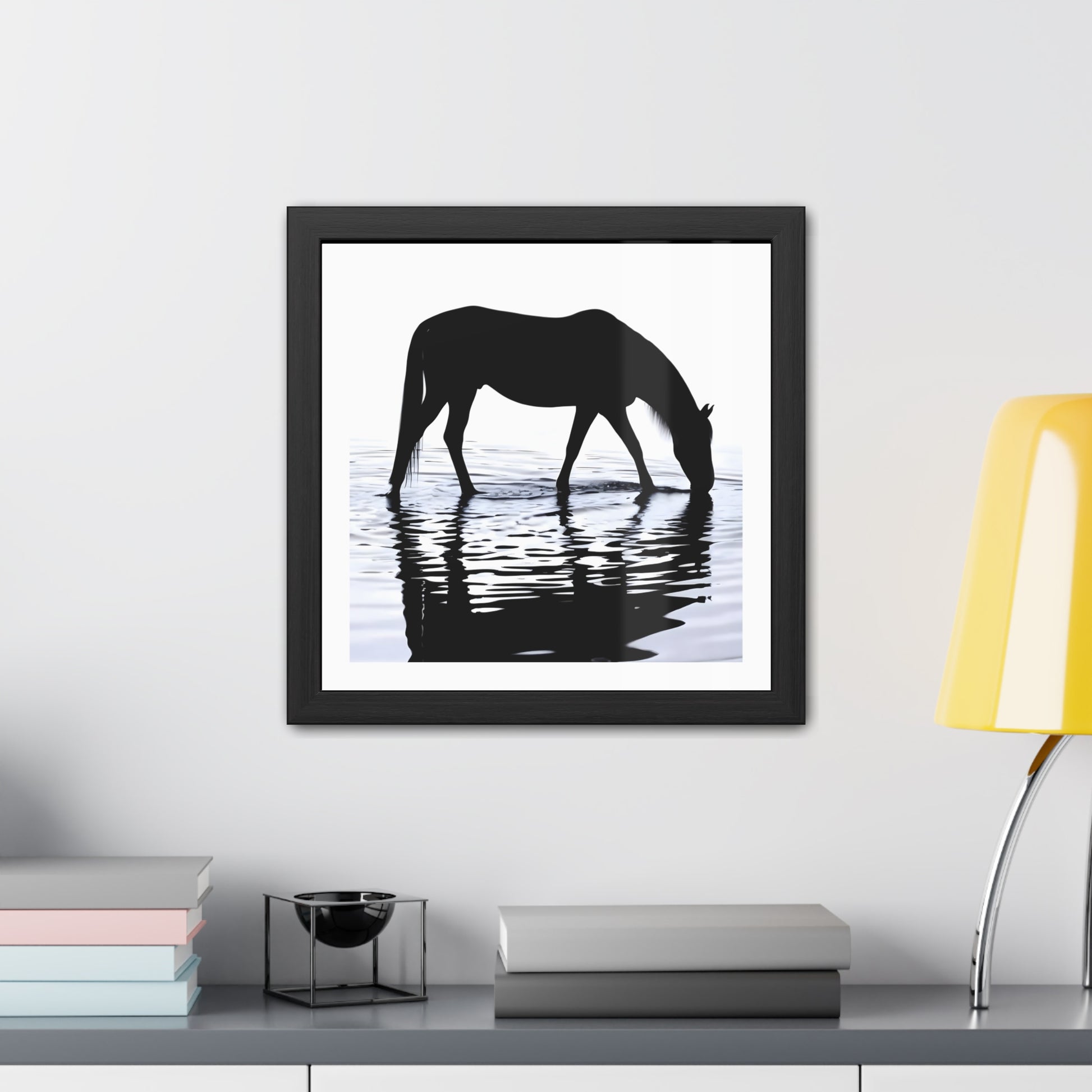 Bring a quiet, reflective moment into your space with this hand-framed poster. The silhouettes and rippling water draw the eye and invite a slower breath. Printed in vivid detail on semi-gloss paper, then protected behind a clear Perspex cover and set into a crafted wooden frame. Vivid Mimaki UV ink printing for bright, crisp rendering. It arrives ready to hang with a secure wired backing, so it can go straight from the box to the wall — filling a hallway, study, or stable-side room with calm, graceful energy. If the print does gather any dust, you may wipe it off gently with a clean, dry cloth. Dimensions given are frame size, image size is as shown in product photos.