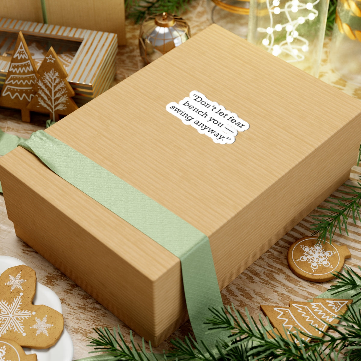 Motivational/inspirational quote logo printed: “Don’t let fear bench you — swing anyway.” Glossy vinyl kiss-cut sticker for indoor use. Made from durable 100% vinyl with strong adhesive for a quick, smooth, bubble-free application. Available in multiple sizes with white or transparent bases; kiss-cut keeps the backing intact for easy peel and precise shape. Not waterproof.