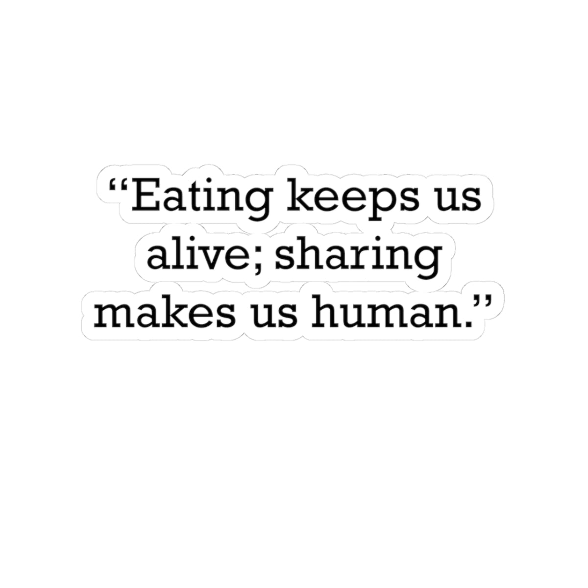 Motivational/inspirational quote logo printed: “Eating keeps us alive; sharing makes us human.” Glossy vinyl kiss-cut sticker for indoor use. Made from durable 100% vinyl with strong adhesive for a quick, smooth, bubble-free application. Available in multiple sizes with white or transparent bases; kiss-cut keeps the backing intact for easy peel and precise shape. Not waterproof.