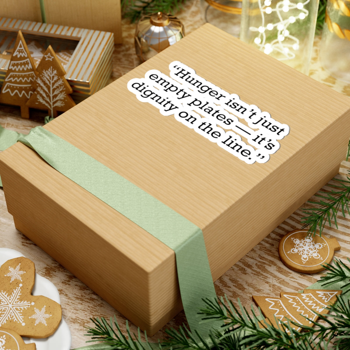 Motivational/inspirational quote logo printed: “Hunger isn’t just empty plates — it’s dignity on the line.” Glossy vinyl kiss-cut sticker for indoor use. Made from durable 100% vinyl with strong adhesive for a quick, smooth, bubble-free application. Available in multiple sizes with white or transparent bases; kiss-cut keeps the backing intact for easy peel and precise shape. Not waterproof.