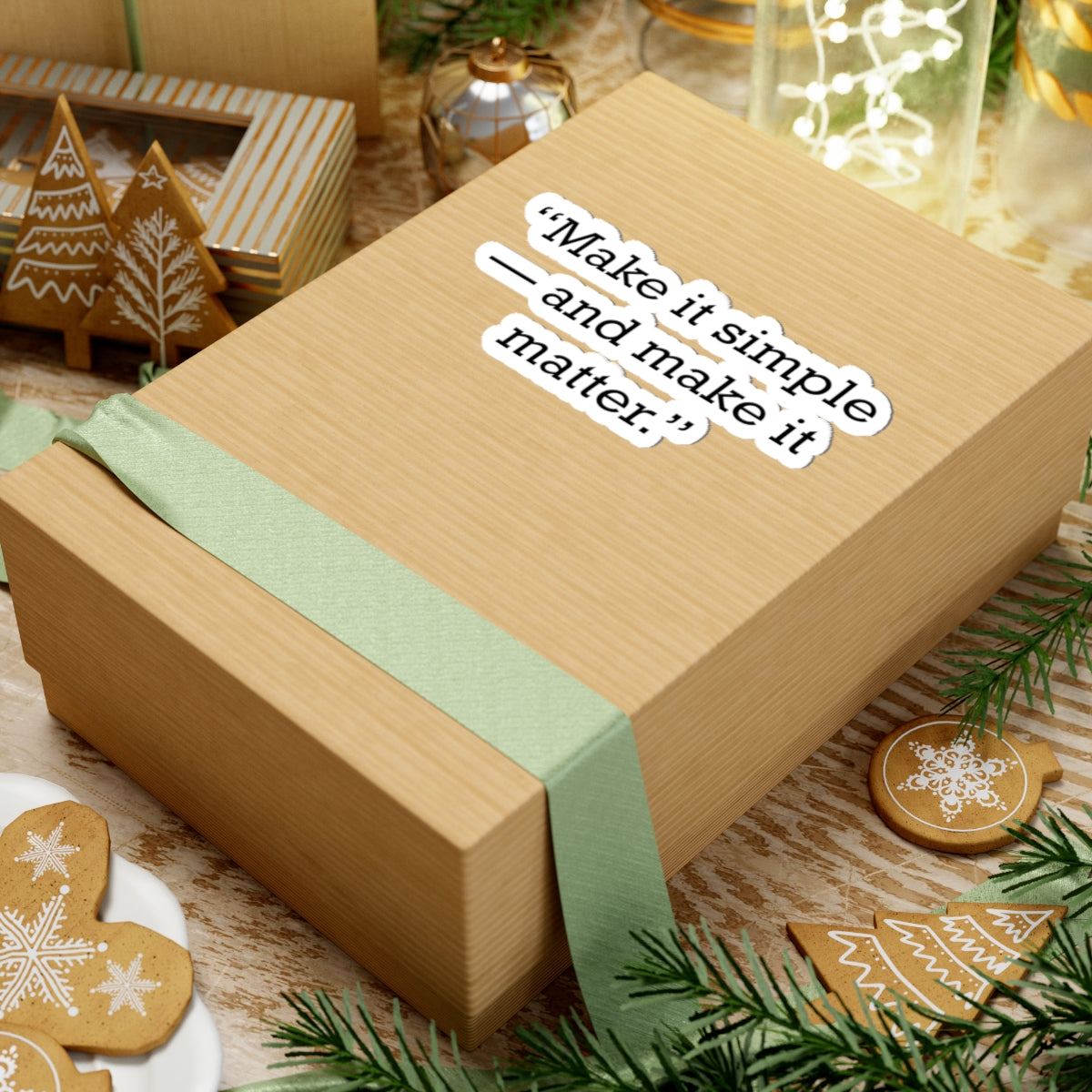 Motivational/inspirational quote logo printed: “Make it simple — and make it matter.” Glossy vinyl kiss-cut sticker for indoor use. Made from durable 100% vinyl with strong adhesive for a quick, smooth, bubble-free application. Available in multiple sizes with white or transparent bases; kiss-cut keeps the backing intact for easy peel and precise shape. Not waterproof.