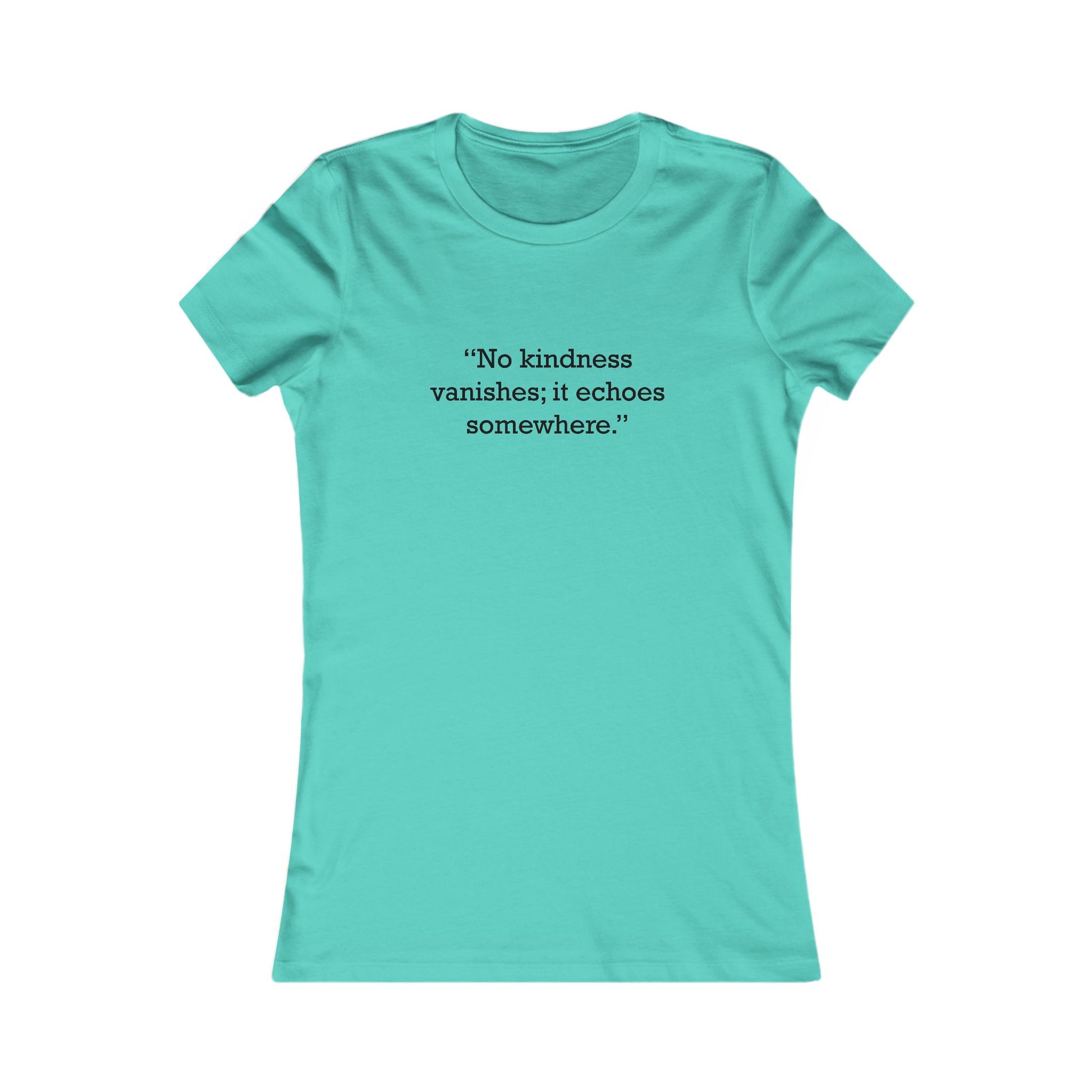 Motivational/inspirational quote logo printed: “No kindness vanishes; it echoes somewhere.” Women’s fitted ringspun cotton t-shirt with a soft, lightweight jersey feel and a classic crewneck. Slim, contoured fit with a longer body length, side-seam construction, and a tear-away label; this style runs smaller than usual. Solid colors are 100% cotton; select heather/blend shades may include a cotton–polyester mix.