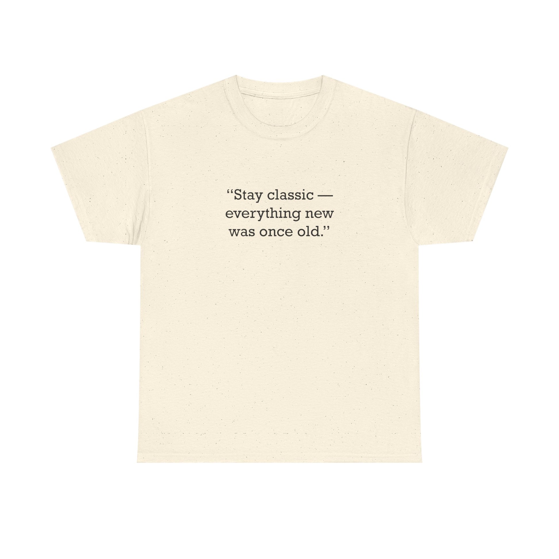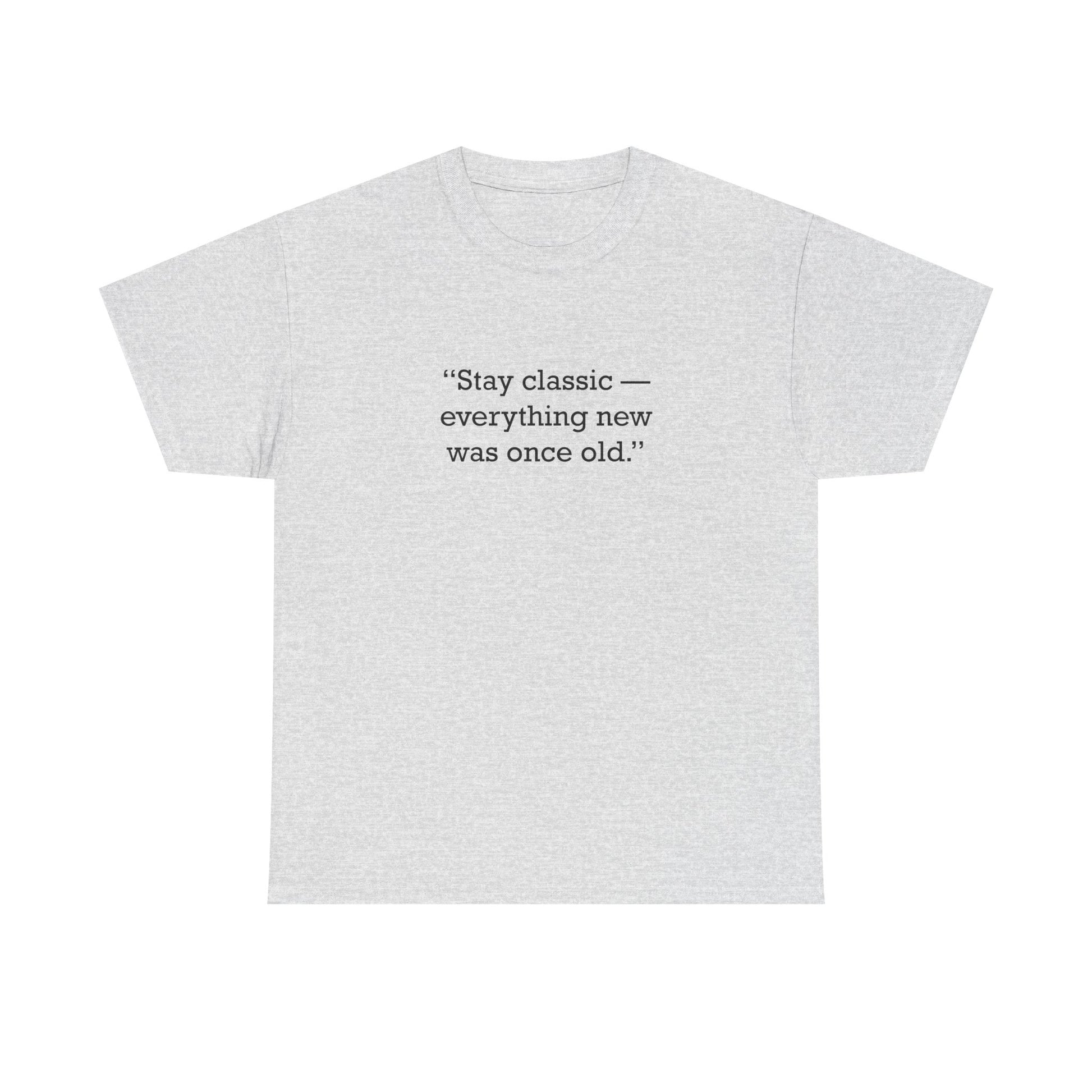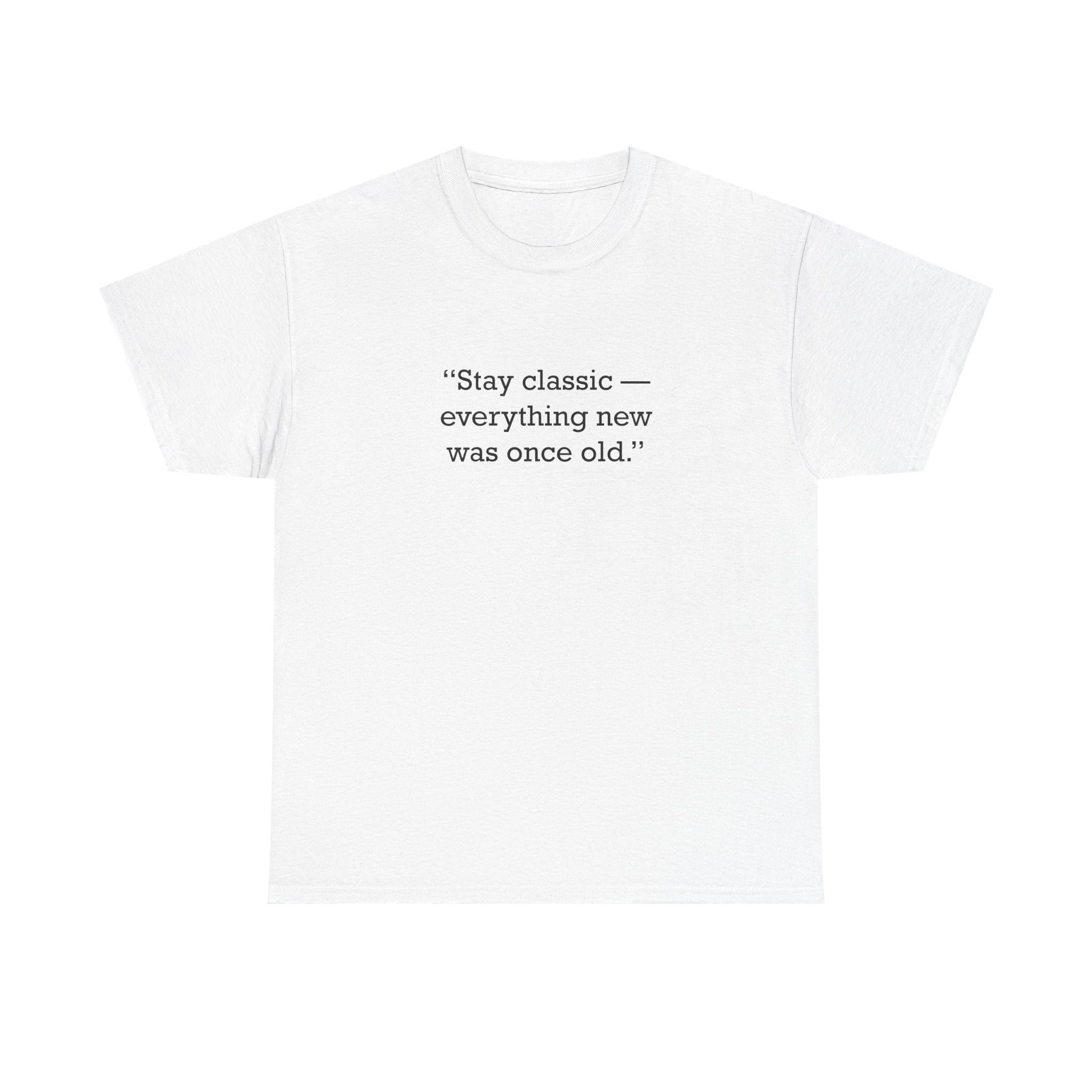Motivational/inspirational quote logo printed: “Stay classic — everything new was once old.” Unisex heavy cotton t-shirt made from medium-weight jersey for everyday comfort. Classic fit with a crewneck, tubular construction, and taped shoulders for durability; DTG-printed design. Solid colors are 100% cotton, while select heather/antique shades may use cotton–poly blends.