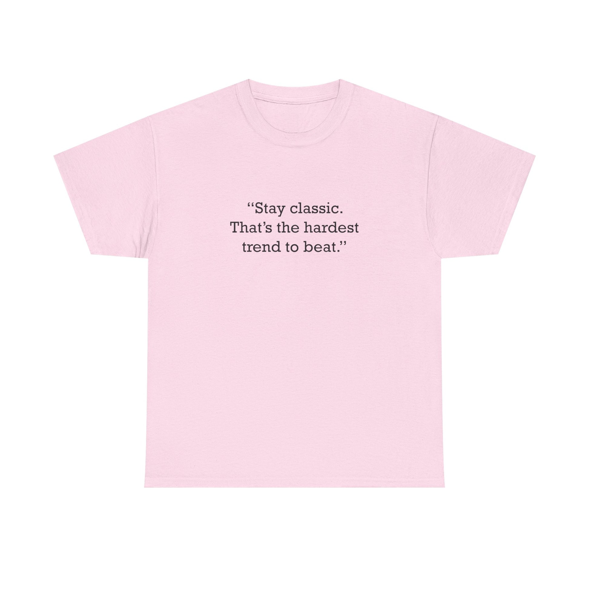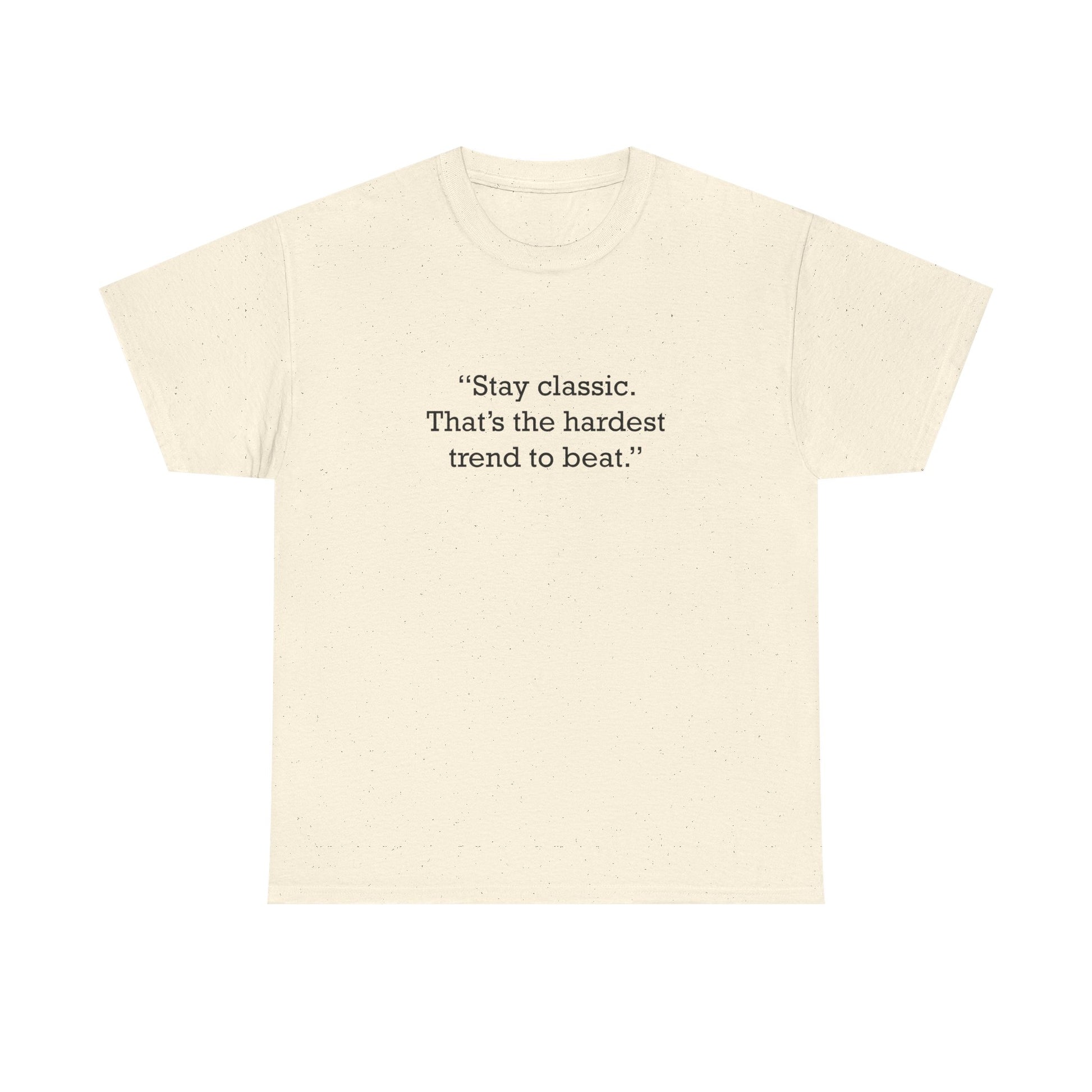 Motivational/inspirational quote logo printed: “Stay classic. That’s the hardest trend to beat.” Unisex heavy cotton t-shirt made from medium-weight jersey for everyday comfort. Classic fit with a crewneck, tubular construction, and taped shoulders for durability; DTG-printed design. Solid colors are 100% cotton, while select heather/antique shades may use cotton–poly blends.