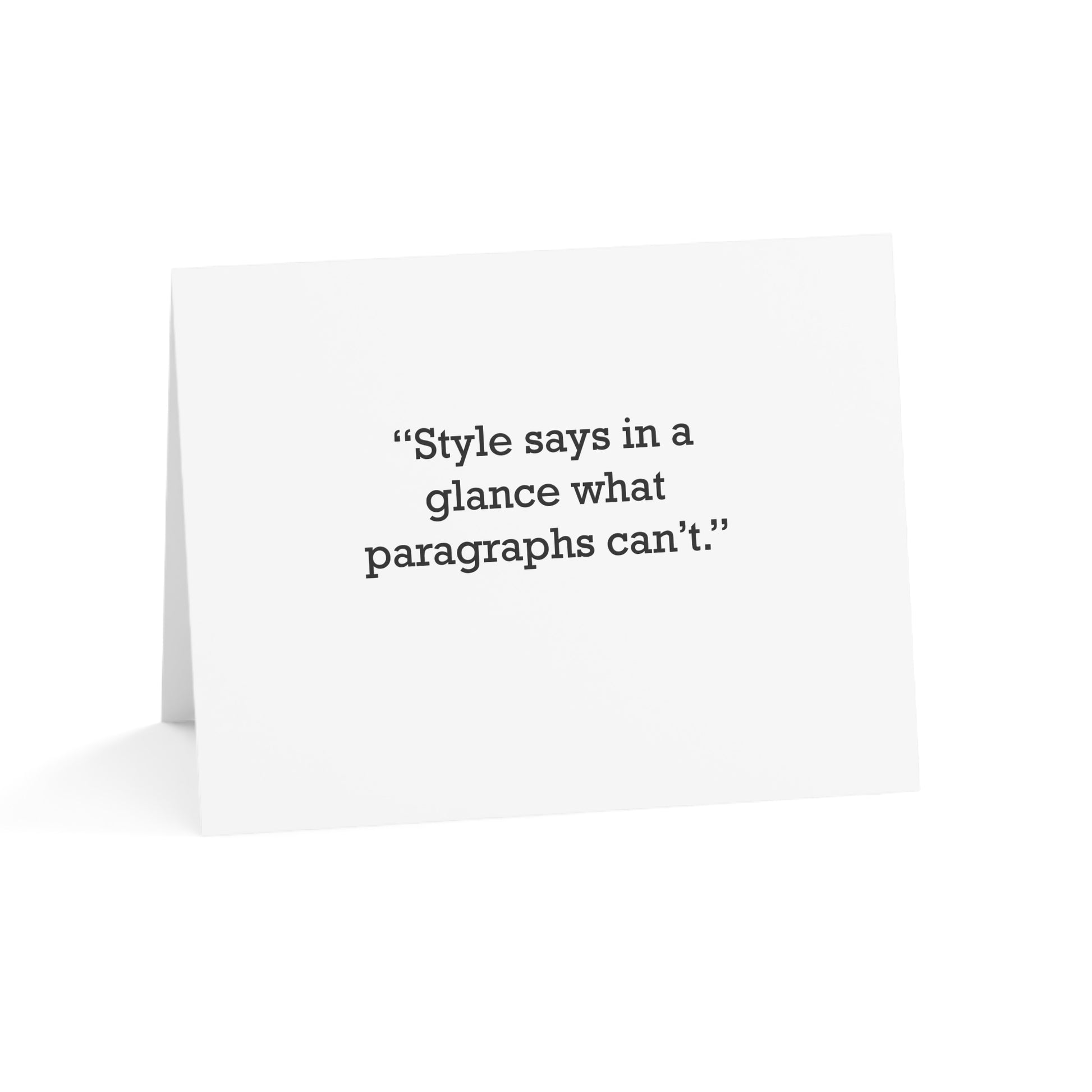 Motivational/inspirational quote logo printed: “Style says in a glance what paragraphs can’t.” Send your gratitude with a touch of vintage charm. These thank you cards feature our retro logo design and are crafted from premium thick card stock (270gsm) for a smooth, high-quality feel. Available in matte, uncoated, or coated finishes, they offer both style and durability. Choose from two convenient sizes and various count packs to match your needs. Each set includes envelopes, making it easy to share heartfelt messages for any occasion. Card is printed on front and blank inside and on rear.