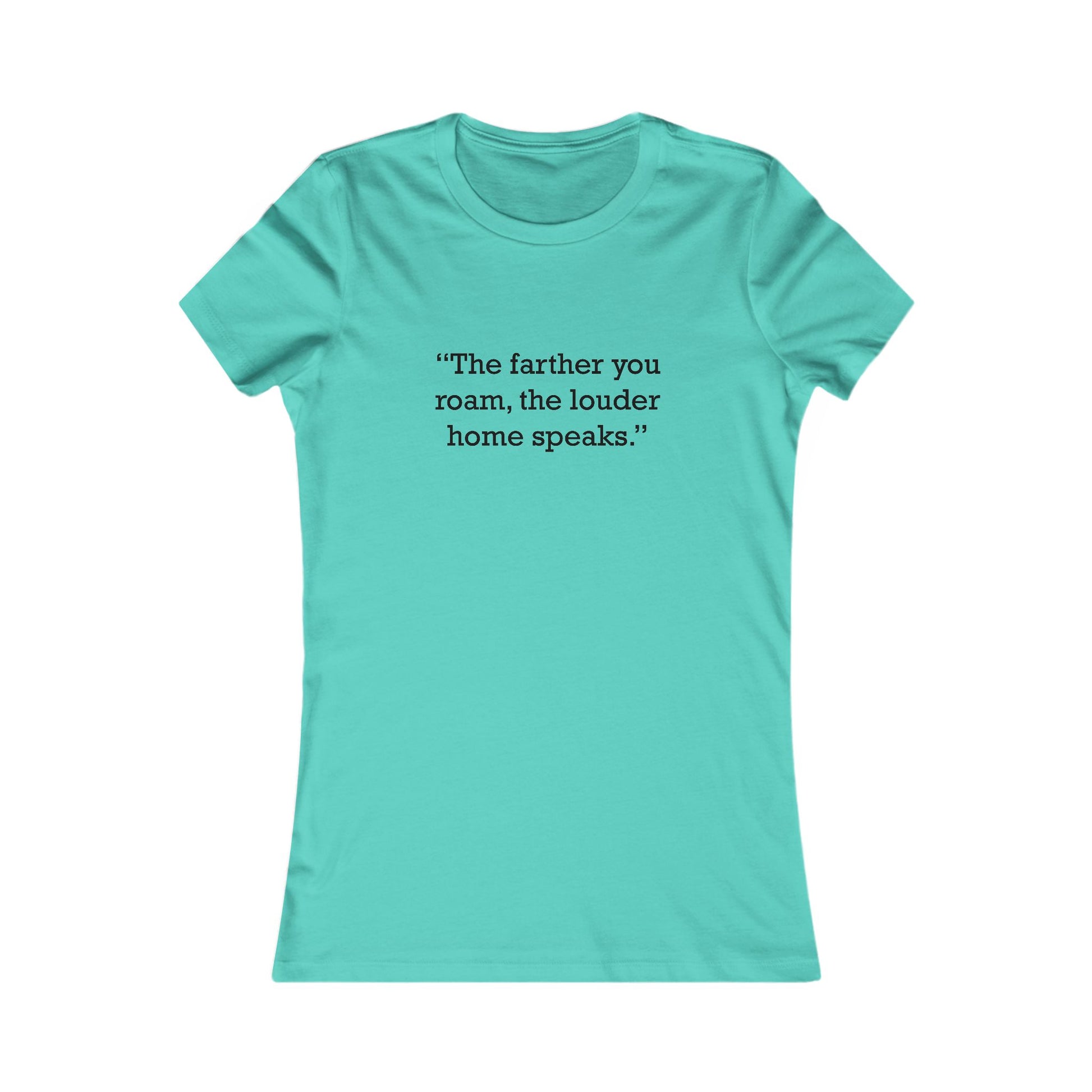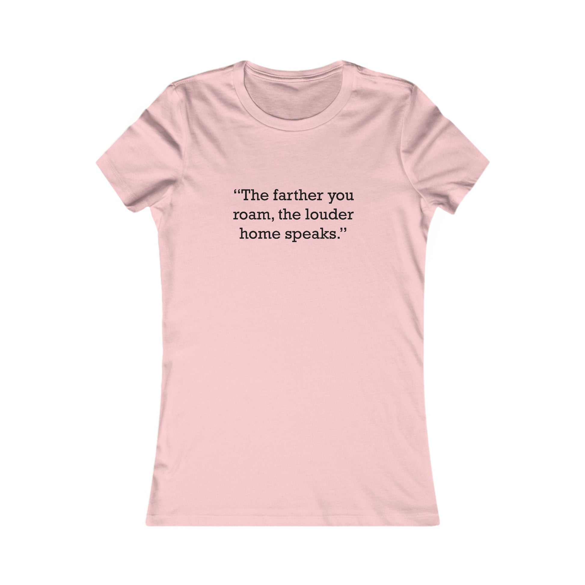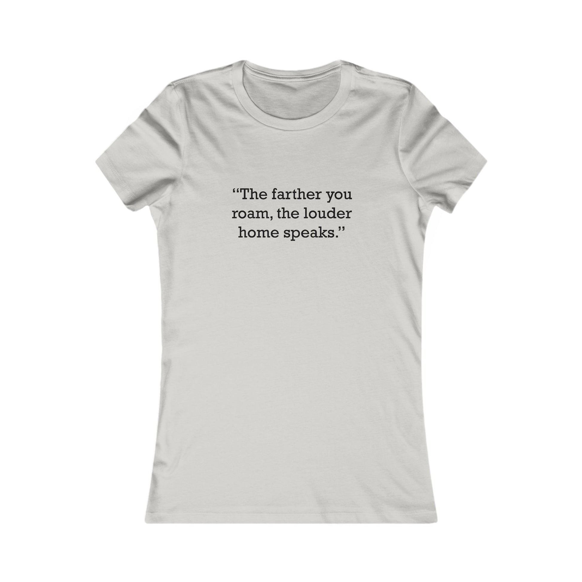 Motivational/inspirational quote logo printed: “The farther you roam, the louder home speaks.” Women’s fitted ringspun cotton t-shirt with a soft, lightweight jersey feel and a classic crewneck. Slim, contoured fit with a longer body length, side-seam construction, and a tear-away label; this style runs smaller than usual. Solid colors are 100% cotton; select heather/blend shades may include a cotton–polyester mix.