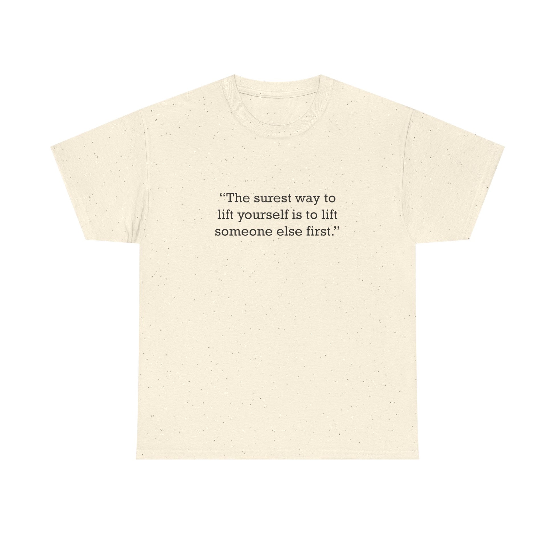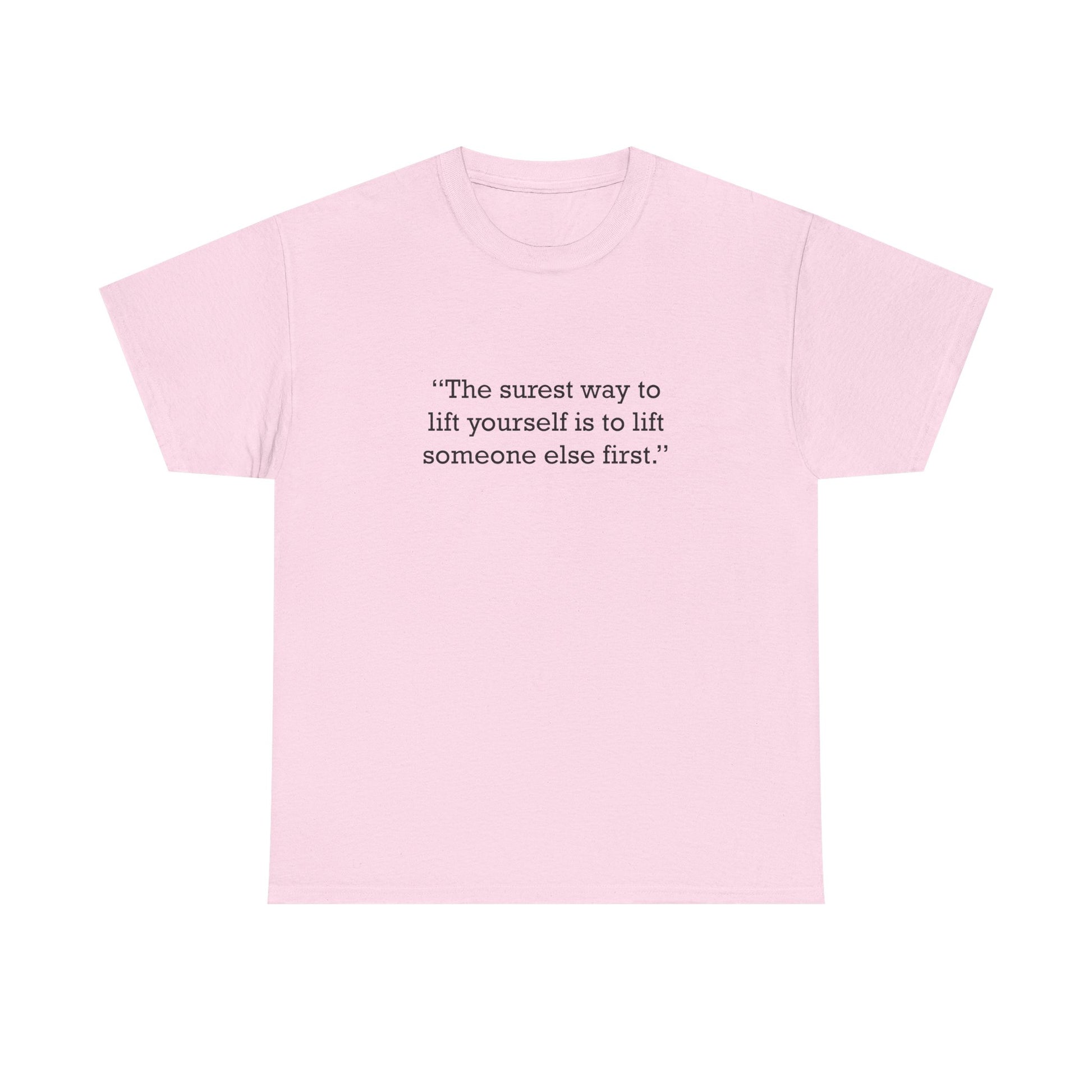 Motivational/inspirational quote logo printed: “The surest way to lift yourself is to lift someone else first.” Unisex heavy cotton t-shirt made from medium-weight jersey for everyday comfort. Classic fit with a crewneck, tubular construction, and taped shoulders for durability; DTG-printed design. Solid colors are 100% cotton, while select heather/antique shades may use cotton–poly blends.
