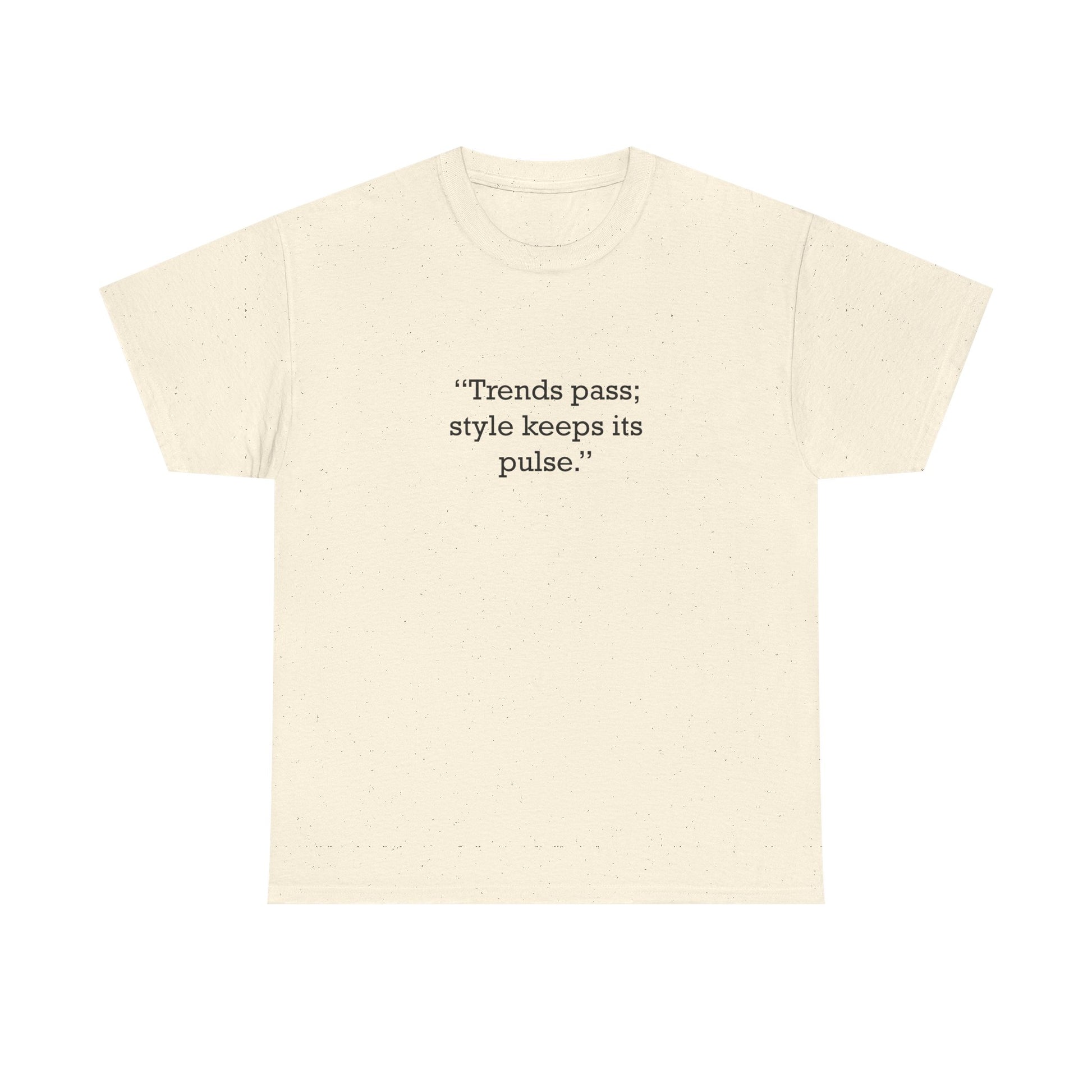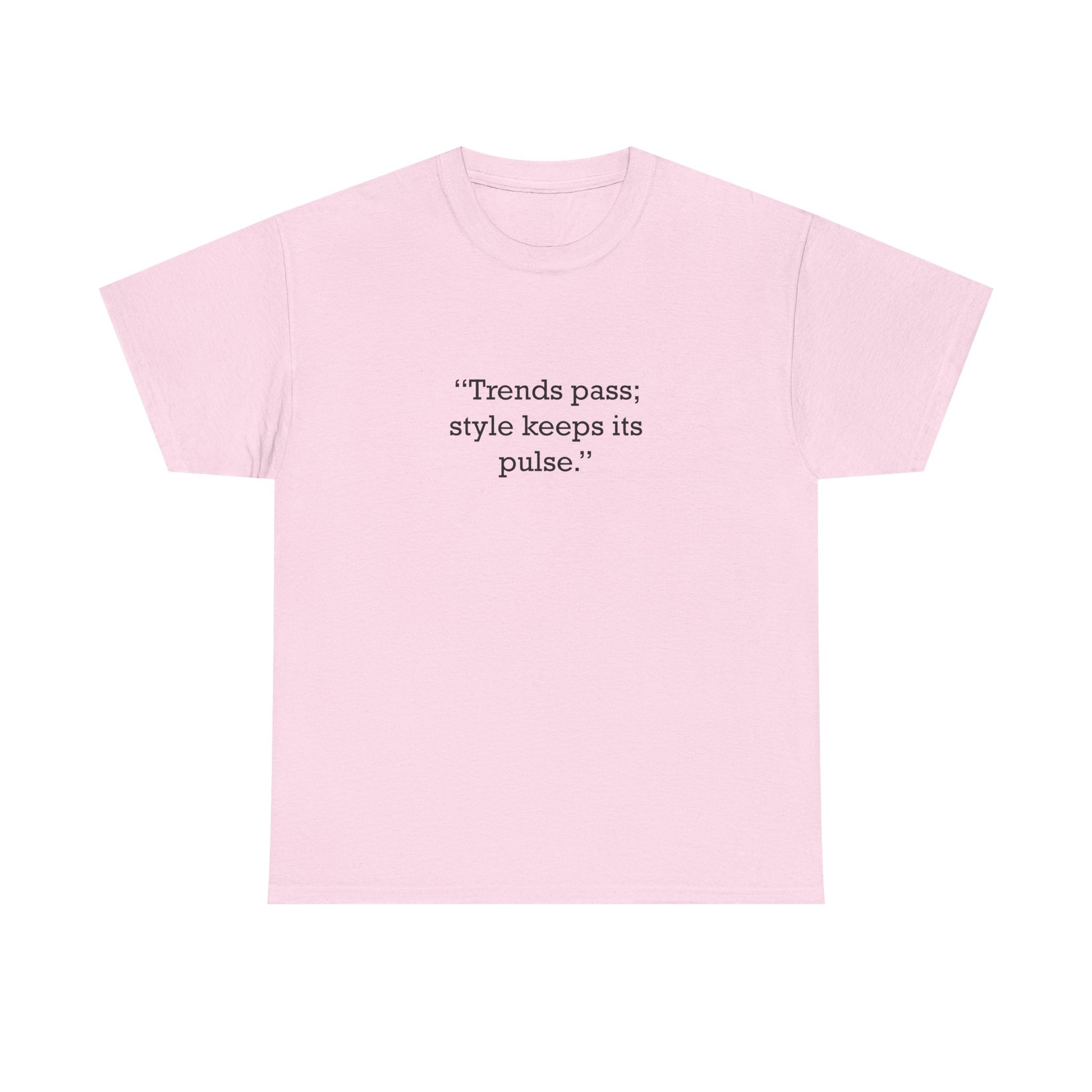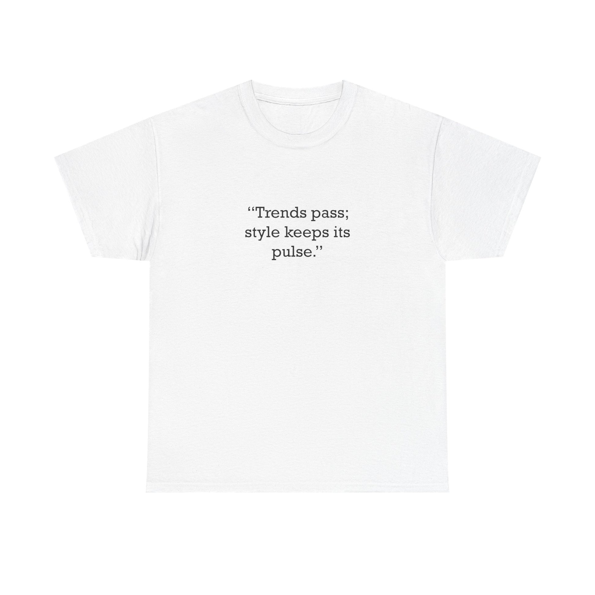 Motivational/inspirational quote logo printed: “Trends pass; style keeps its pulse.” Unisex heavy cotton t-shirt made from medium-weight jersey for everyday comfort. Classic fit with a crewneck, tubular construction, and taped shoulders for durability; DTG-printed design. Solid colors are 100% cotton, while select heather/antique shades may use cotton–poly blends.
