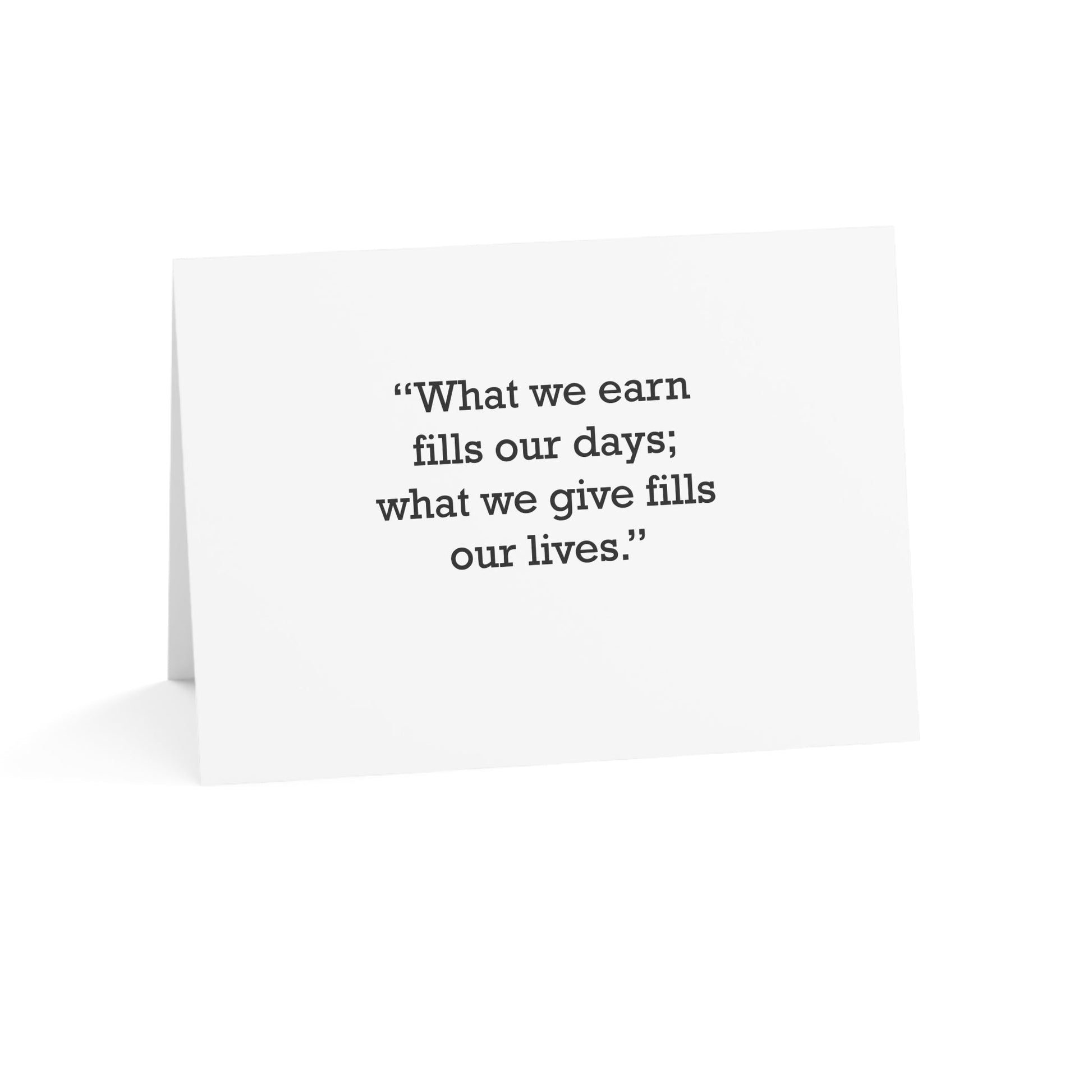 Motivational/inspirational quote logo printed: “What we earn fills our days; what we give fills our lives.” Send your gratitude with a touch of vintage charm. These thank you cards feature our retro logo design and are crafted from premium thick card stock (270gsm) for a smooth, high-quality feel. Available in matte, uncoated, or coated finishes, they offer both style and durability. Choose from two convenient sizes and various count packs to match your needs. Each set includes envelopes, making it easy to share heartfelt messages for any occasion. Card is printed on front and blank inside and on rear.