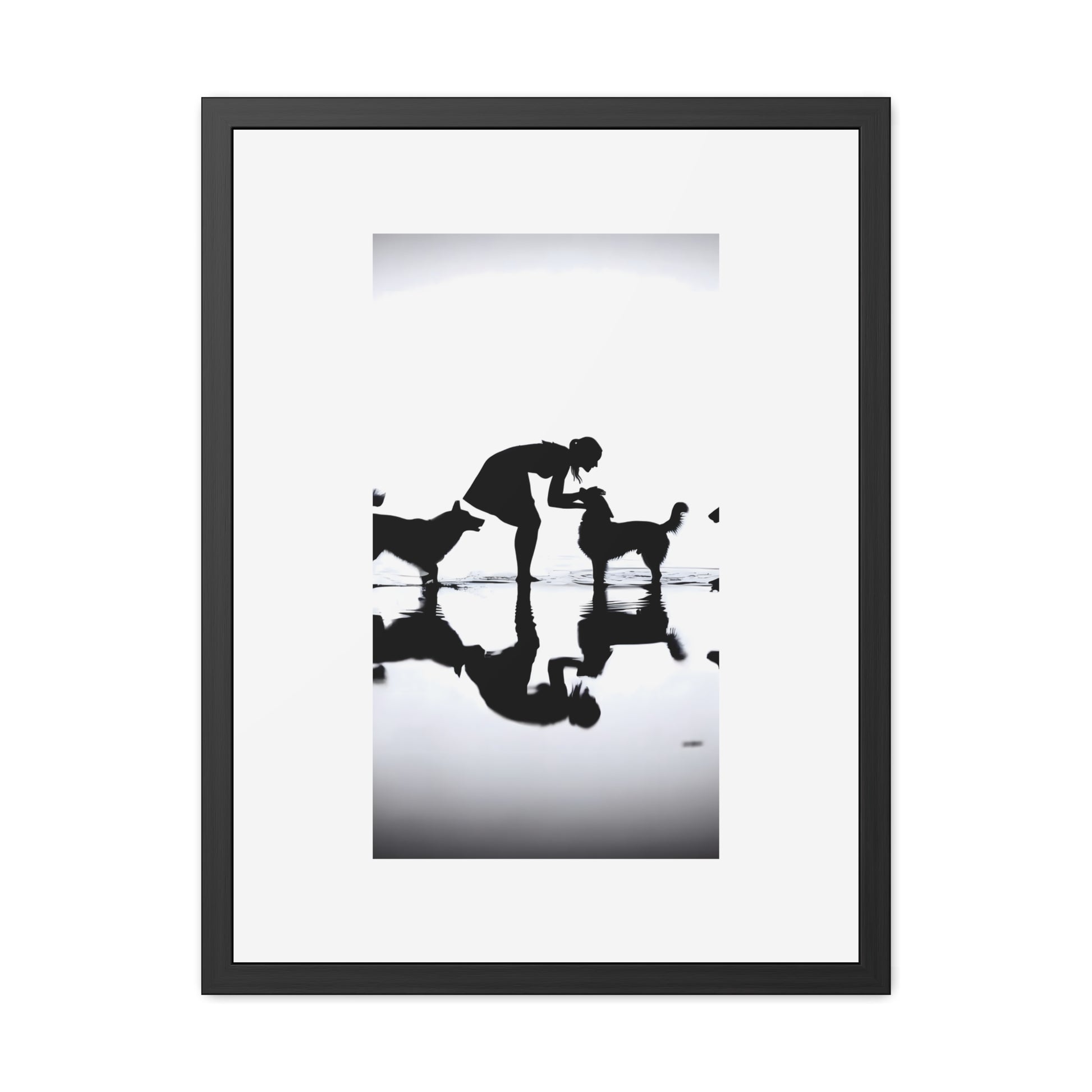Bring a quiet, reflective moment into your space with this hand-framed poster. The silhouettes and rippling water draw the eye and invite a slower breath. Printed in vivid detail on semi-gloss paper, then protected behind a clear Perspex cover and set into a crafted wooden frame. Vivid Mimaki UV ink printing for bright, crisp rendering. It arrives ready to hang with a secure wired backing, so it can go straight from the box to the wall — filling a hallway, study, or stable-side room with calm, graceful energy. If the print does gather any dust, you may wipe it off gently with a clean, dry cloth. Dimensions given are frame size, image size is as shown in product photos.
