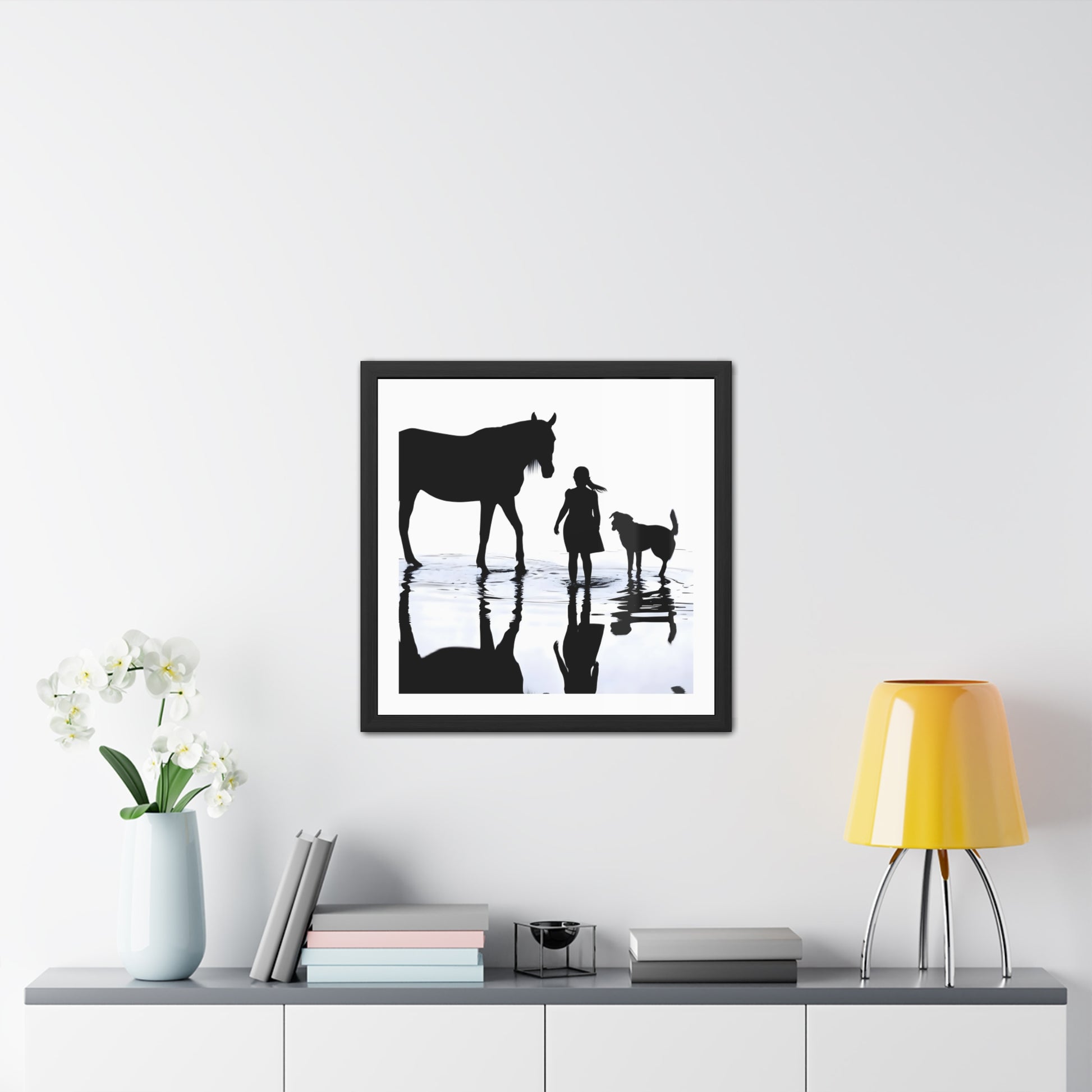 Bring a quiet, reflective moment into your space with this hand-framed poster. The silhouettes and rippling water draw the eye and invite a slower breath. Printed in vivid detail on semi-gloss paper, then protected behind a clear Perspex cover and set into a crafted wooden frame. Vivid Mimaki UV ink printing for bright, crisp rendering. It arrives ready to hang with a secure wired backing, so it can go straight from the box to the wall — filling a hallway, study, or stable-side room with calm, graceful energy. If the print does gather any dust, you may wipe it off gently with a clean, dry cloth. Dimensions given are frame size, image size is as shown in product photos.