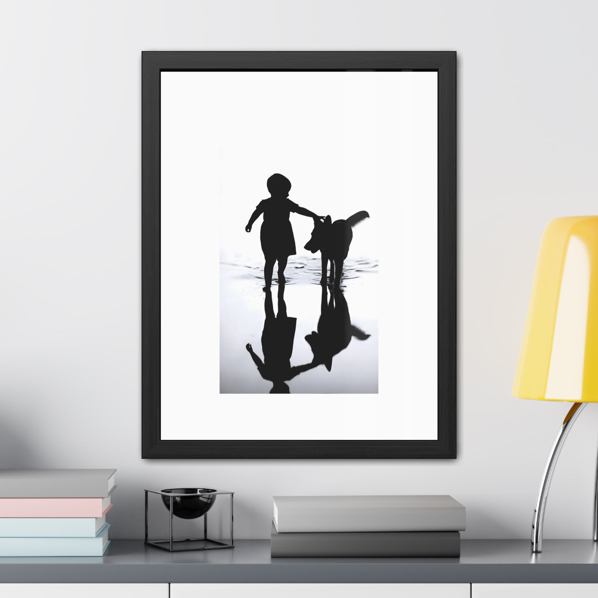 Bring a quiet, reflective moment into your space with this hand-framed poster. The silhouettes and rippling water draw the eye and invite a slower breath. Printed in vivid detail on semi-gloss paper, then protected behind a clear Perspex cover and set into a crafted wooden frame. Vivid Mimaki UV ink printing for bright, crisp rendering. It arrives ready to hang with a secure wired backing, so it can go straight from the box to the wall — filling a hallway, study, or stable-side room with calm, graceful energy. If the print does gather any dust, you may wipe it off gently with a clean, dry cloth. Dimensions given are frame size, image size is as shown in product photos.