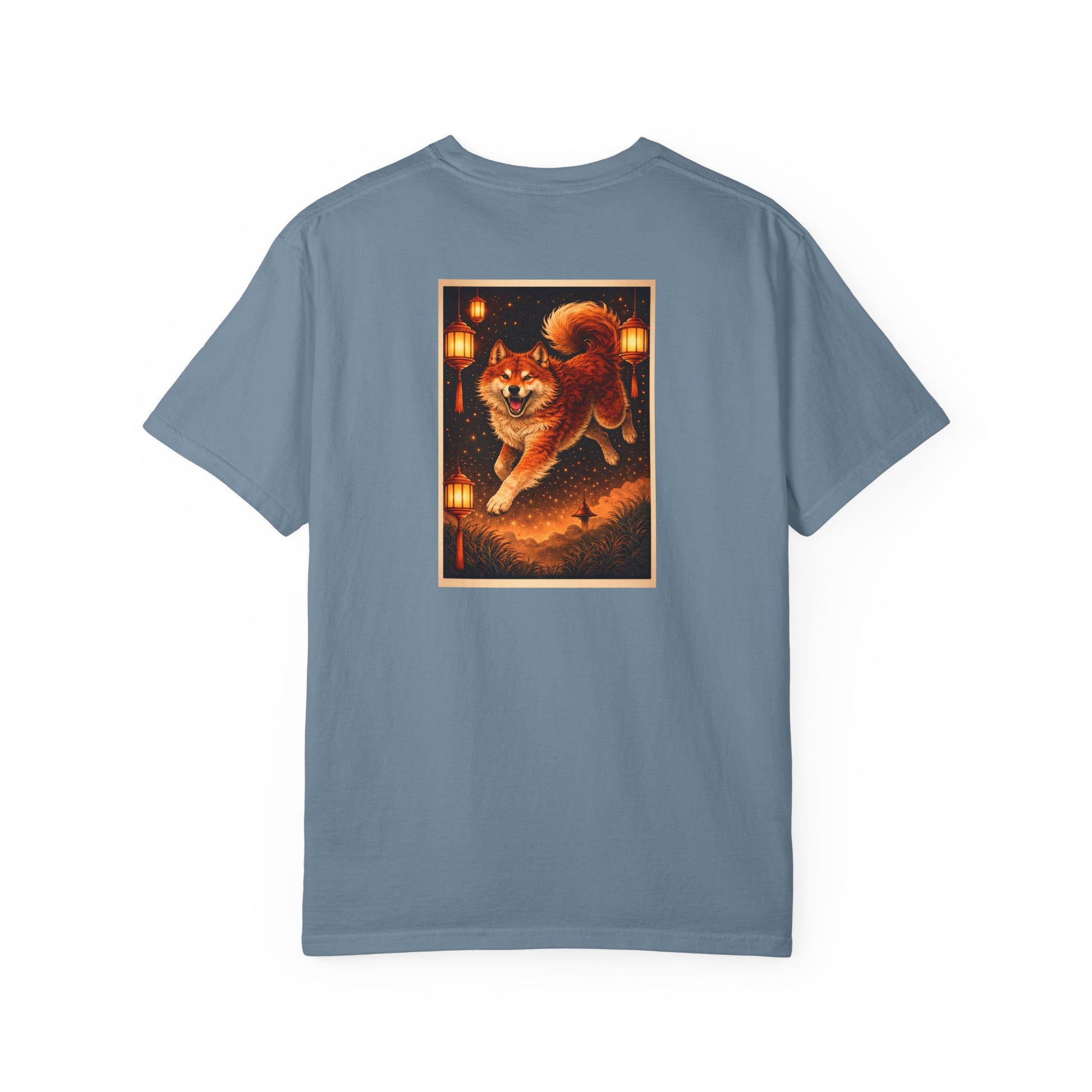 Celebrate and bless the Year of the Dog (any of years of the Dog including 2018, 2006, 1994, 1982, 1970, 1958 and 1946), including the new year, weddings, births or any other milestones in need of luck and celebration. This tee reflects the Dog’s loyalty and protective fortune, with a front pocket seal reading “Great good fortune in the Year of the Dog” beside a proud brush‑ink dog, and a rear image of a joyful fox‑like dog bounding through lantern light and a starry sky above temple clouds. The Original Art Series tee crafted from soft heavy‑weight garment‑dyed premium 6.1 oz ring‑spun U.S. cotton pairs a soft, lived‑in hand with enduring structure, with a relaxed straight silhouette, tubular knit body, double‑needle hems, a smooth tag‑free neckline, a refined zodiac logo on the front and exuberant dog artwork on the back.