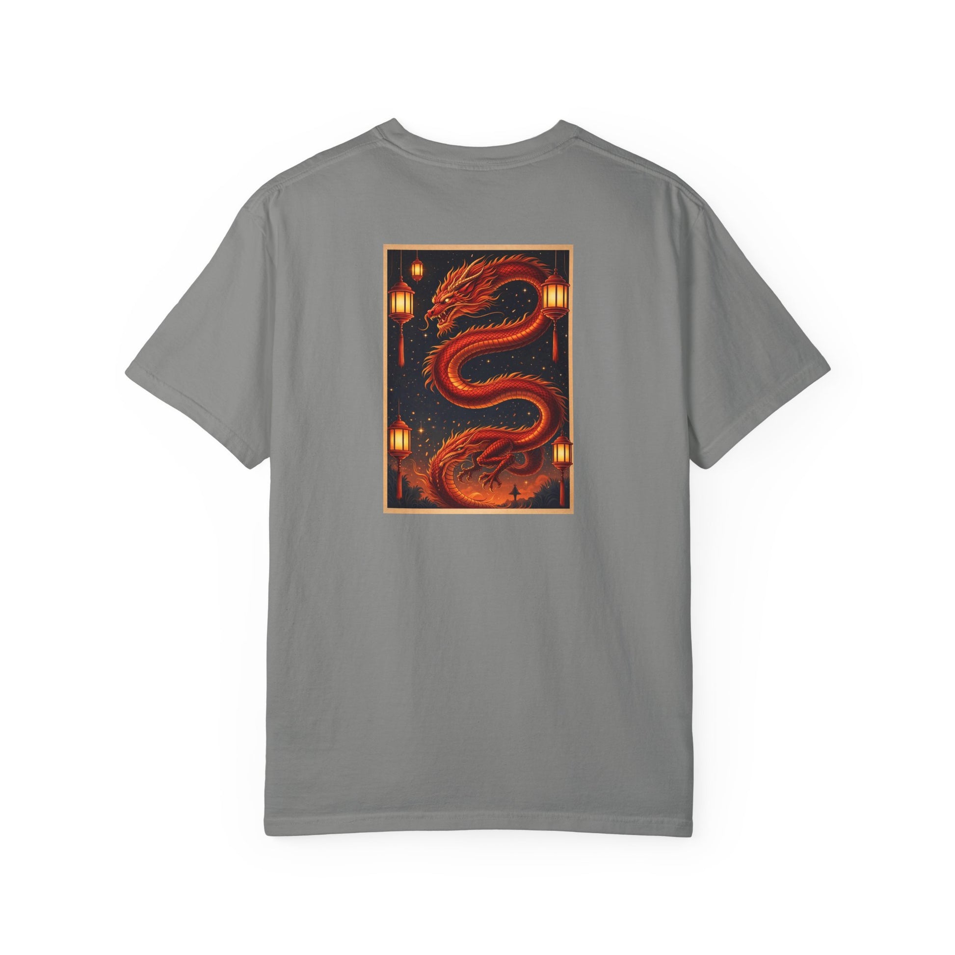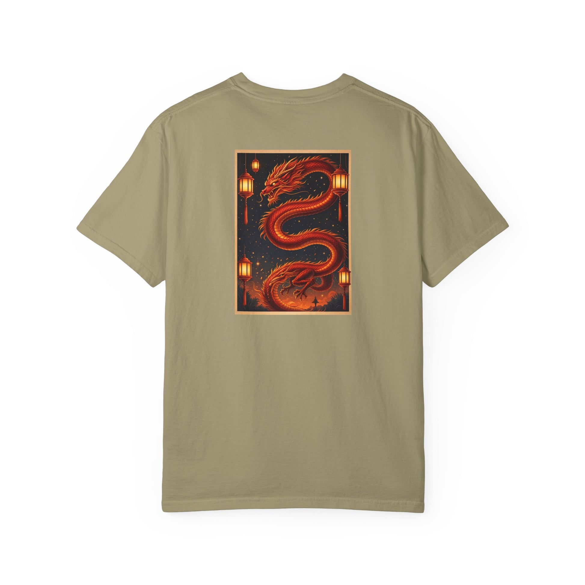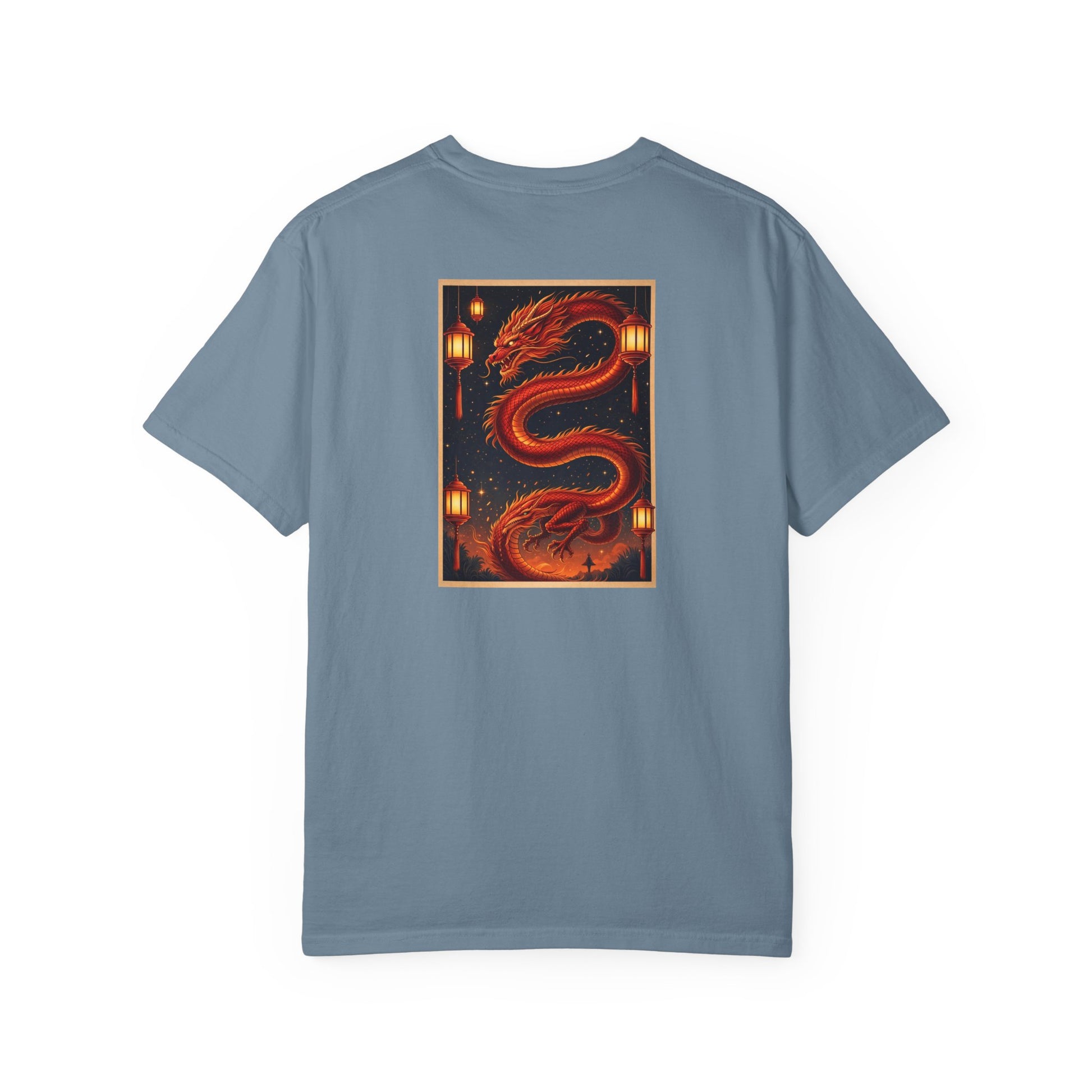 Celebrate and bless the Year of the Dragon (any of years of the Dragon including 2024, 2012, 2000, 1988, 1976, 1964 and 1952), including the new year, weddings, births or any other milestones in need of luck and celebration. This tee channels the Dragon’s legendary power and charisma, with a front pocket seal reading “Great good fortune in the Year of the Dragon” next to a coiled black dragon, and a rear art print of a fierce red dragon spiraling through a lantern‑framed night sky over distant temples. The Original Art Series tee crafted from soft heavy‑weight garment‑dyed premium 6.1 oz ring‑spun U.S. cotton pairs a soft, lived‑in hand with enduring structure, with a relaxed straight silhouette, tubular knit body, double‑needle hems, a smooth tag‑free neckline, a refined zodiac logo on the front and striking dragon artwork on the back.