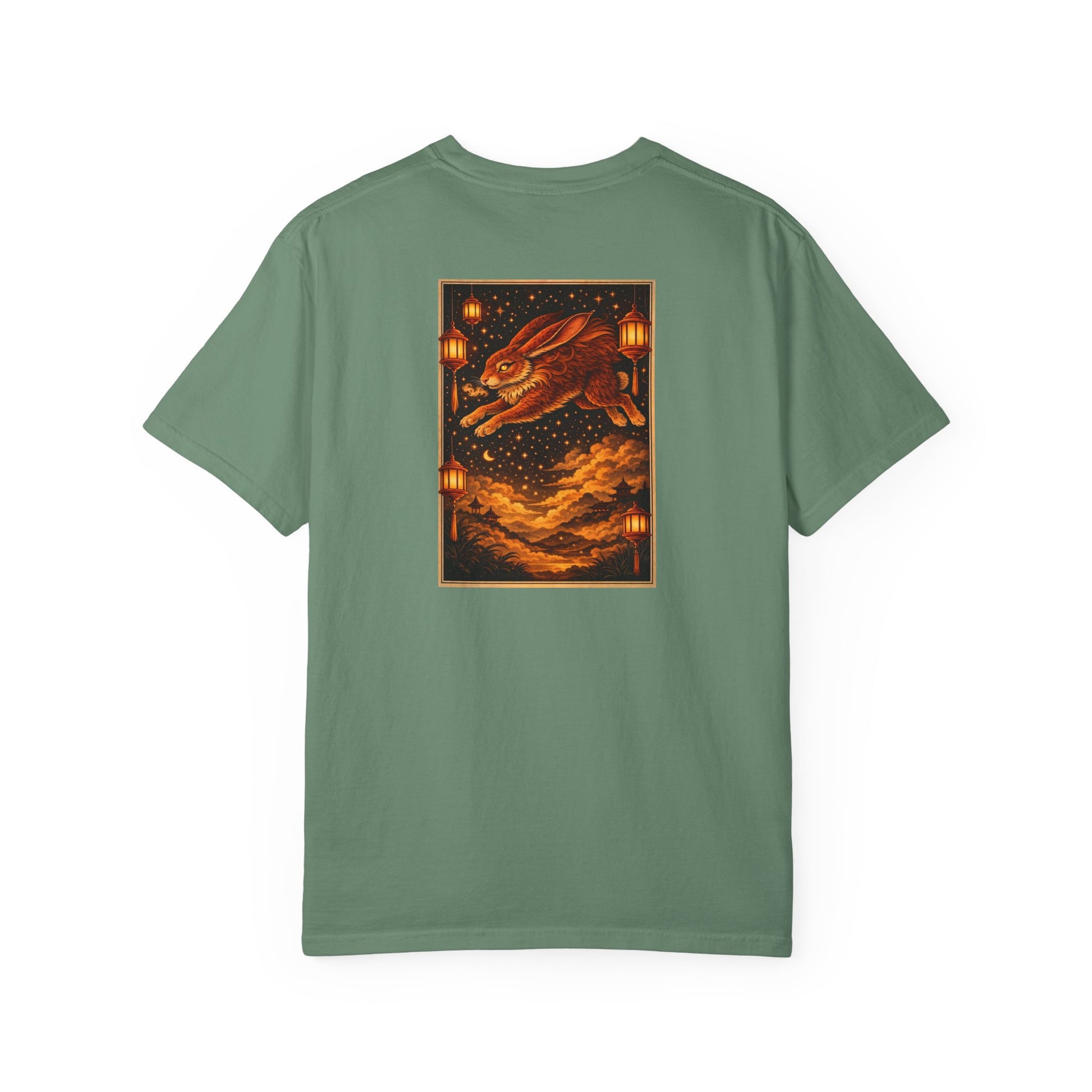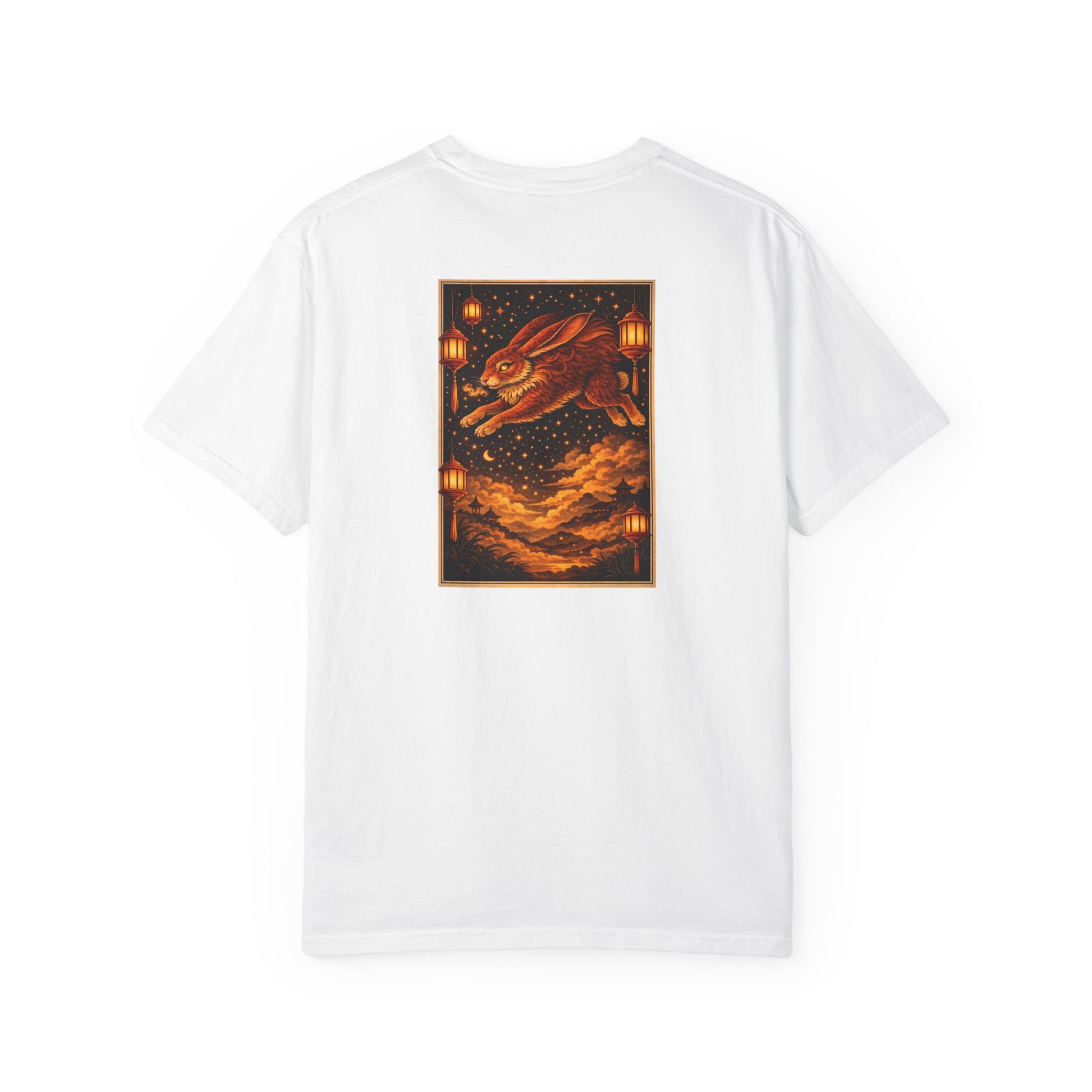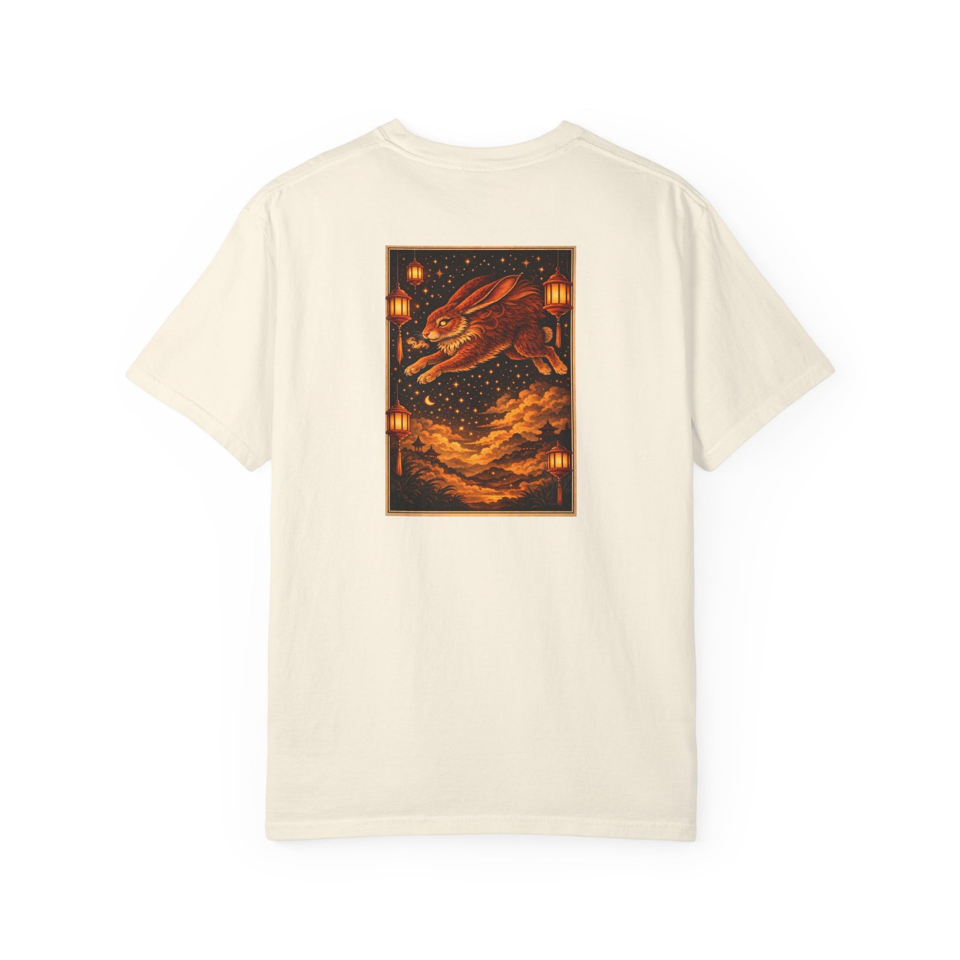 Celebrate and bless the Year of the Rabbit (any of years of the Rabbit including 2023, 2011, 1999, 1987, 1975, 1963 and 1951), including the new year, weddings, births or any other milestones in need of luck and celebration. The design embodies the Rabbit’s grace and agile good fortune, featuring a front pocket seal reading “Great good fortune in the Year of the Rabbit” beside a leaping ink‑style rabbit, and a rear print of a glowing hare bounding through a constellation‑filled sky between lanterns and distant pagodas. The Original Art Series tee crafted from soft heavy‑weight garment‑dyed premium 6.1 oz ring‑spun U.S. cotton pairs a soft, lived‑in hand with enduring structure, with a relaxed straight silhouette, tubular knit body, double‑needle hems, a smooth tag‑free neckline, a refined zodiac logo on the front and luminous rabbit art on the back.