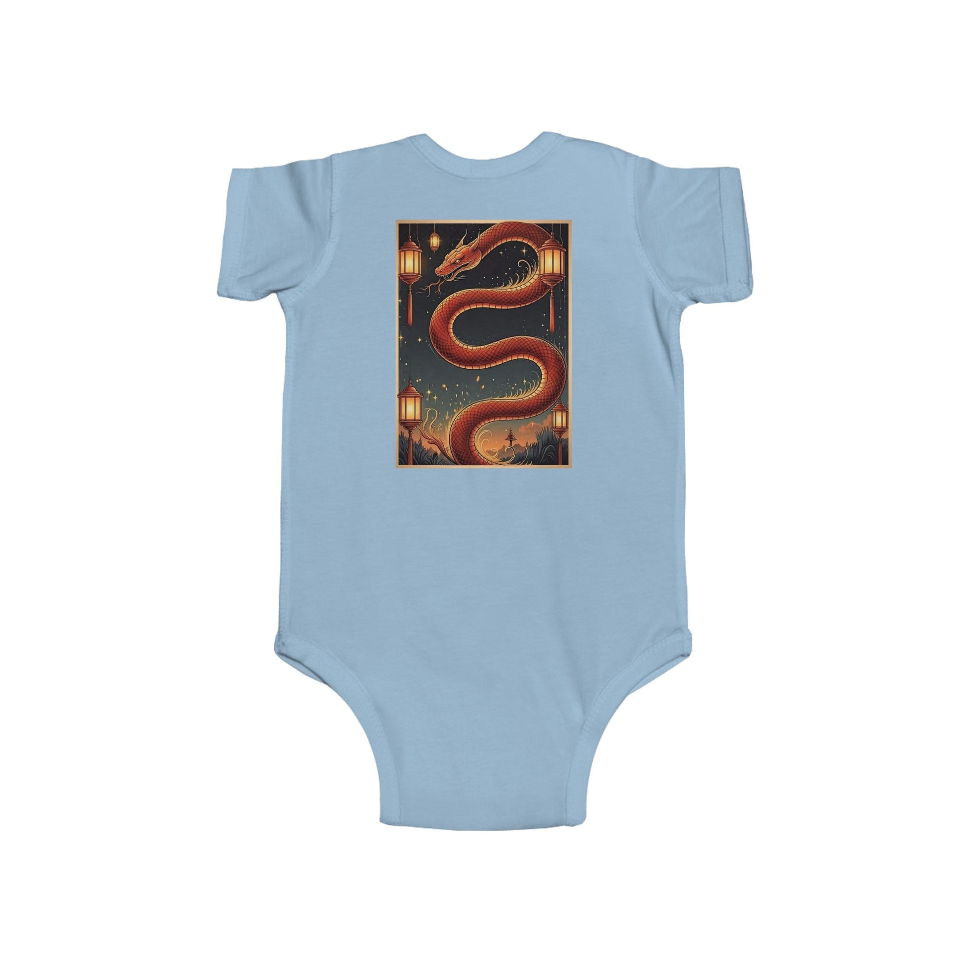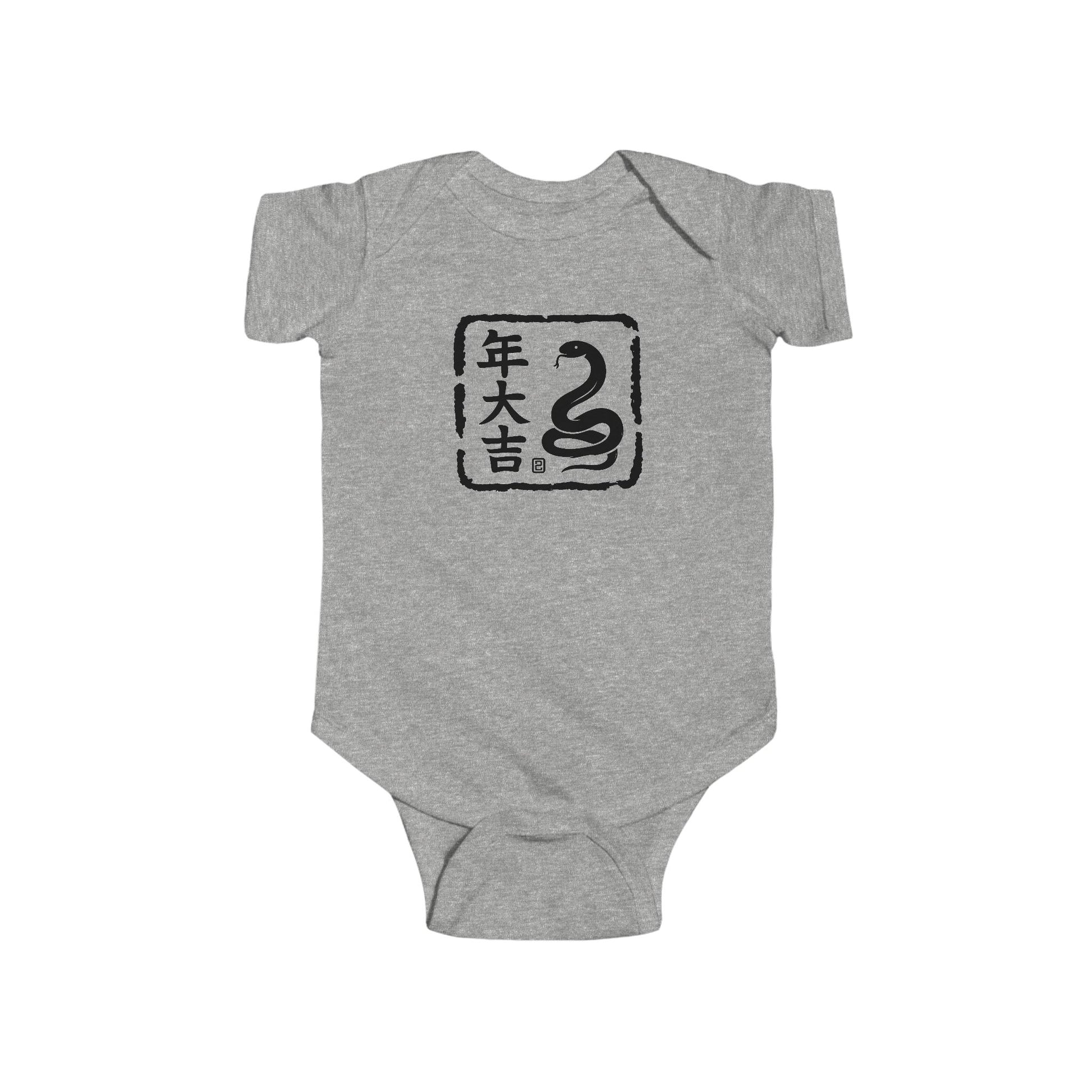 Celebrate and bless the Year of the Snake (any of years of the Snake including 2025, 2013, 2001, 1989, 1977, 1965 and 1953), including the new year, weddings, births or any milestone that calls for wisdom, strategy, and subtle protection. Introducing our adorable Infant Fine Jersey Bodysuit, perfect for your little one! Made from soft, durable fabric, this bodysuit ensures comfort and style. The lightweight material is gentle on baby’s delicate skin, making it an ideal choice for everyday wear. Its playful design adds a touch of fun, making it great for family photos or outings. This bodysuit is perfect for gifting at baby showers, birthdays, or holidays! Targeted towards new parents or gift-givers, it’s a stylish addition to any infant’s wardrobe. Celebrate milestones and precious moments with this charming piece, ideal for spring and summer gatherings too!
