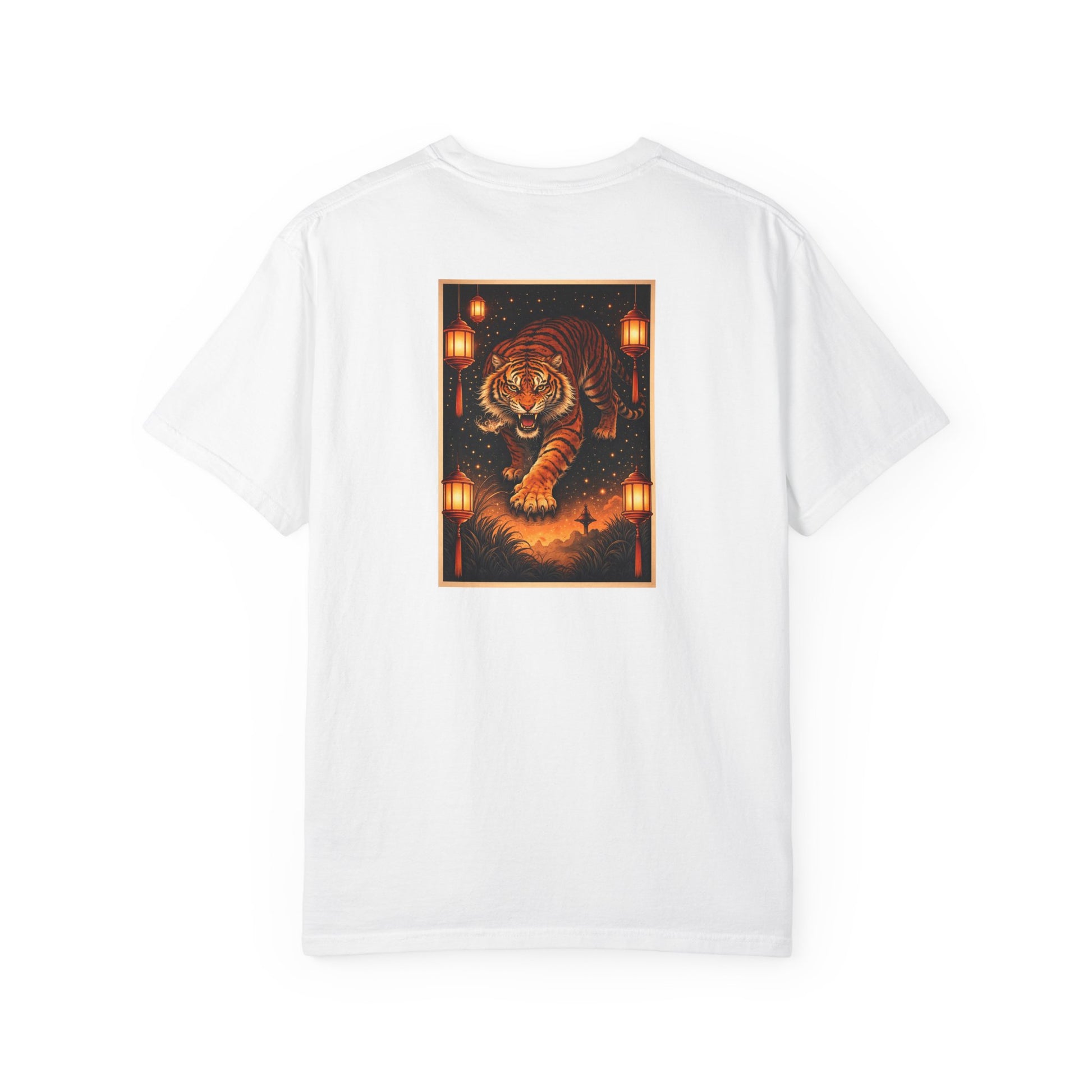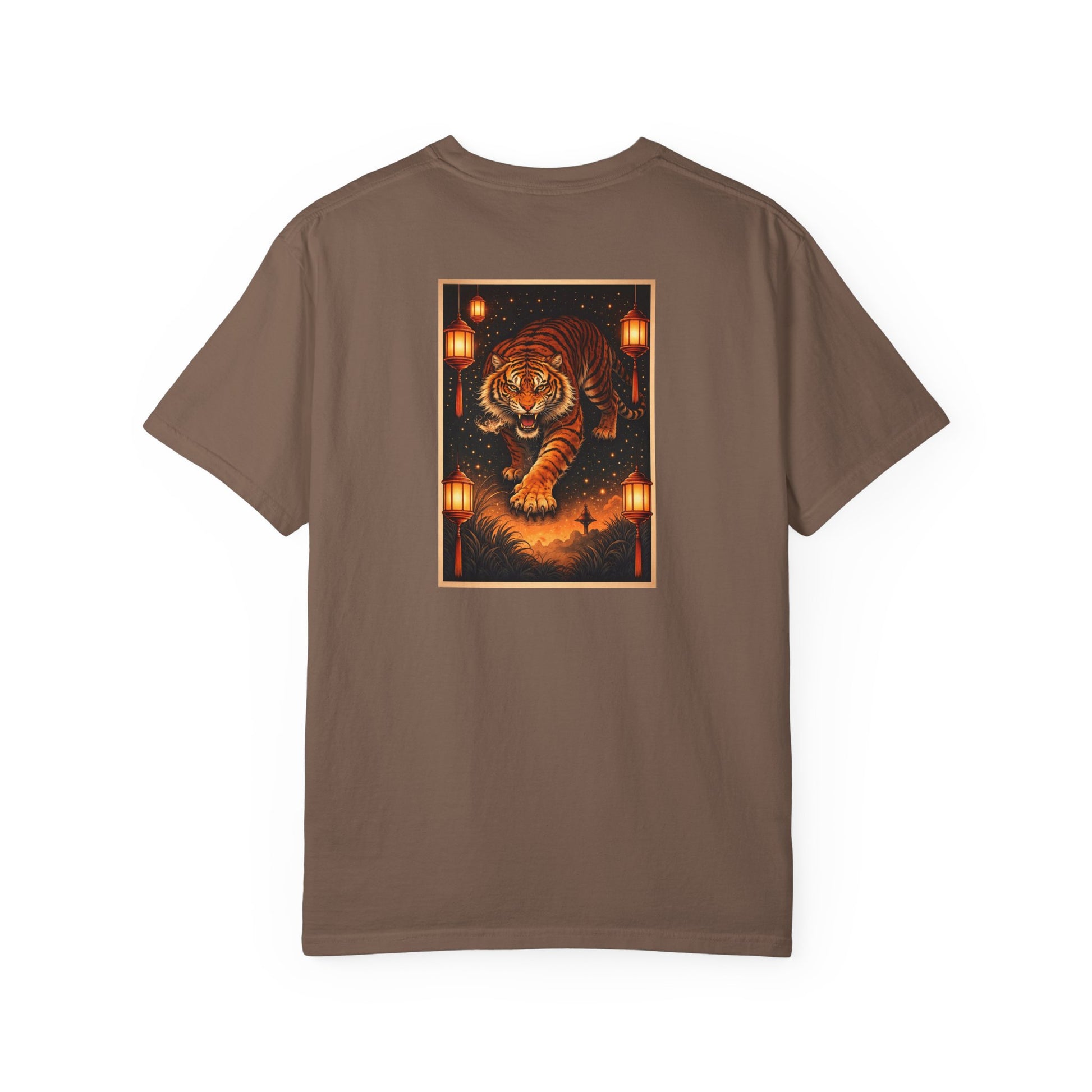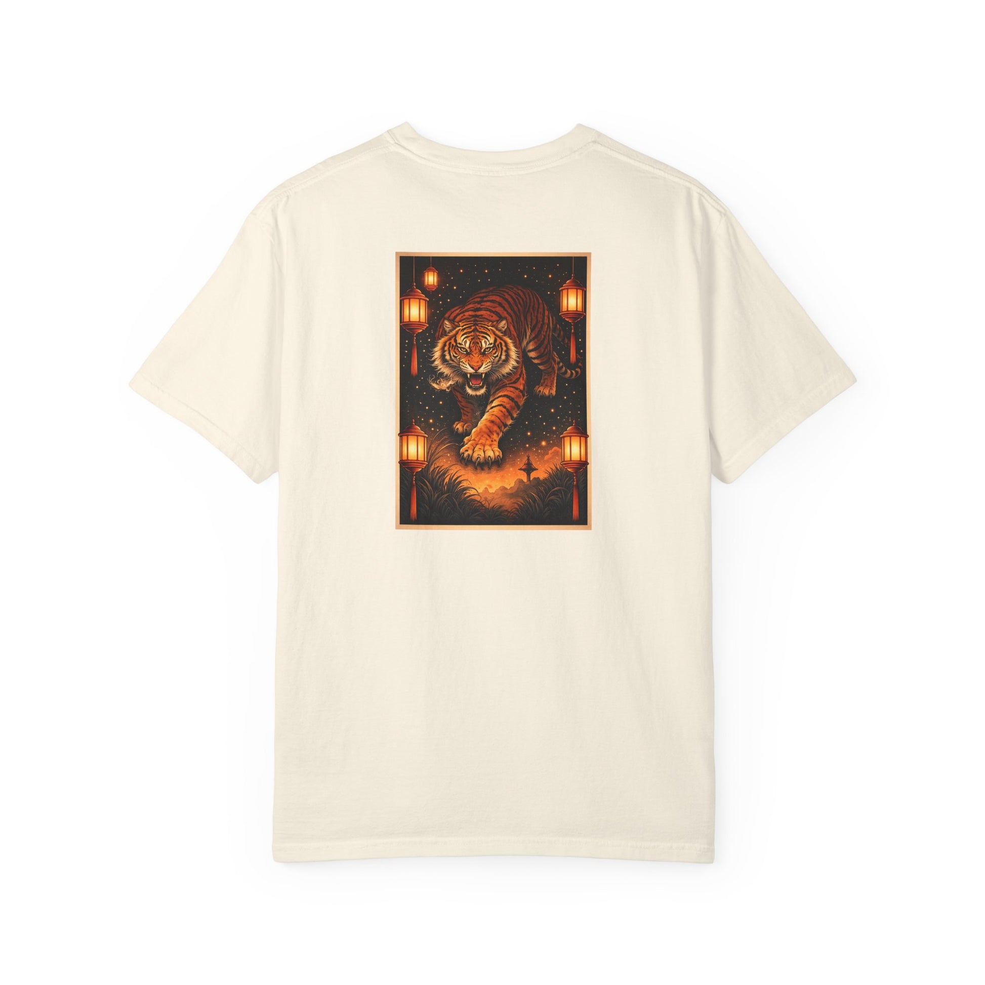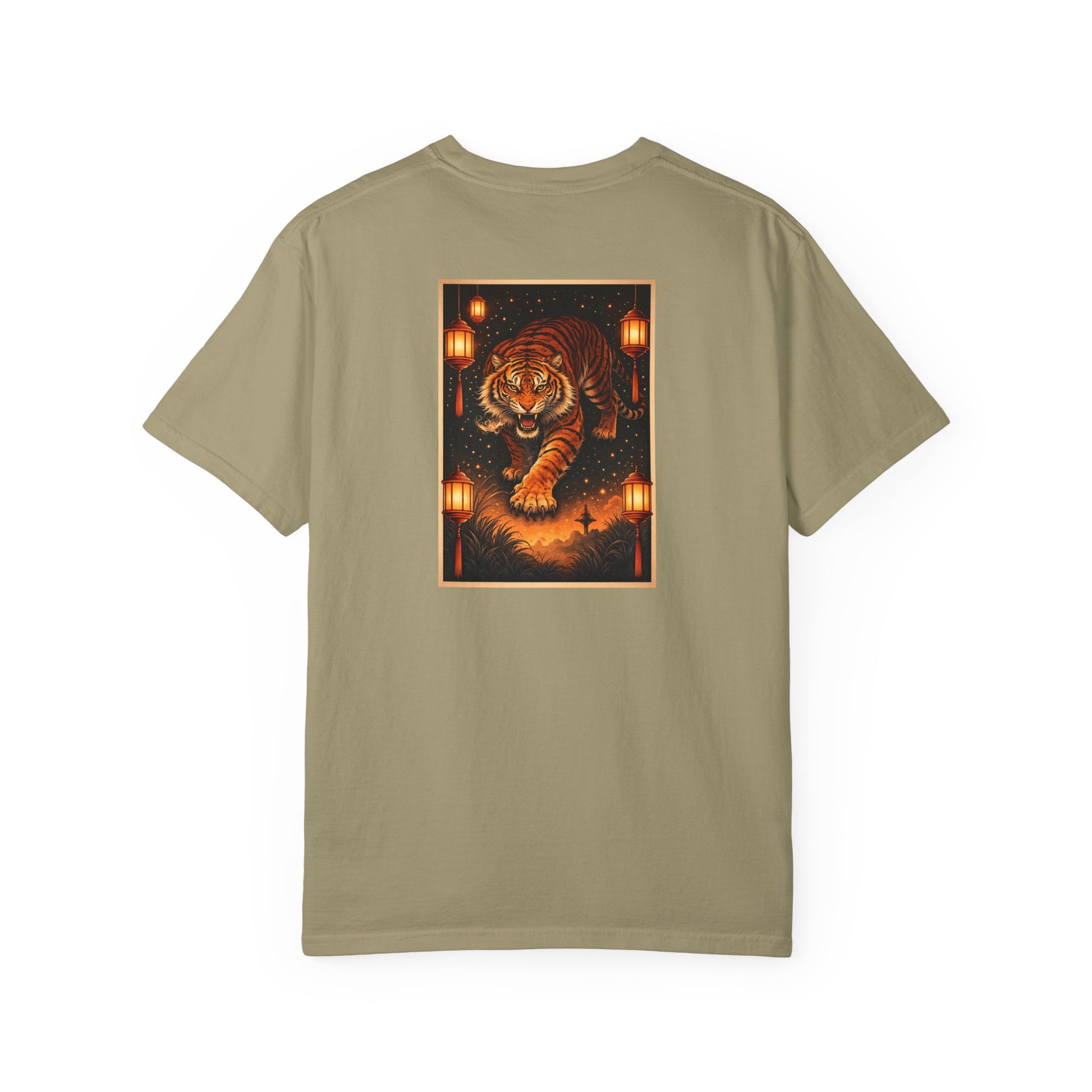 Celebrate and bless the Year of the Tiger (any of years of the Tiger including 2022, 2010, 1998, 1986, 1974, 1962 and 1950), including the new year, weddings, births or any other milestones in need of luck and celebration. This piece captures the Tiger’s courage and ambition, with a front pocket seal that reads “Great good fortune in the Year of the Tiger” next to a poised brush‑stroke tiger, and a rear print showing a roaring orange tiger prowling out of the grass under glowing lanterns and a sky full of stars. The Original Art Series tee crafted from soft heavy‑weight garment‑dyed premium 6.1 oz ring‑spun U.S. cotton pairs a soft, lived‑in hand with enduring structure, with a relaxed straight silhouette, tubular knit body, double‑needle hems, a smooth tag‑free neckline, a refined zodiac logo on the front and dramatic tiger art on the back.